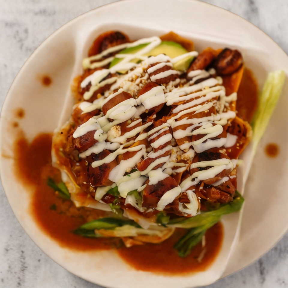Rojos o verdes con chorizo Argentino ahumado 80gr, servicio con queso, crema y aguacate, aderezo de la casa.