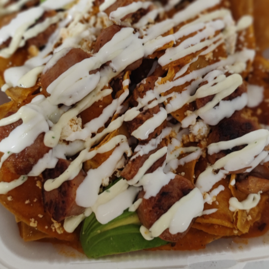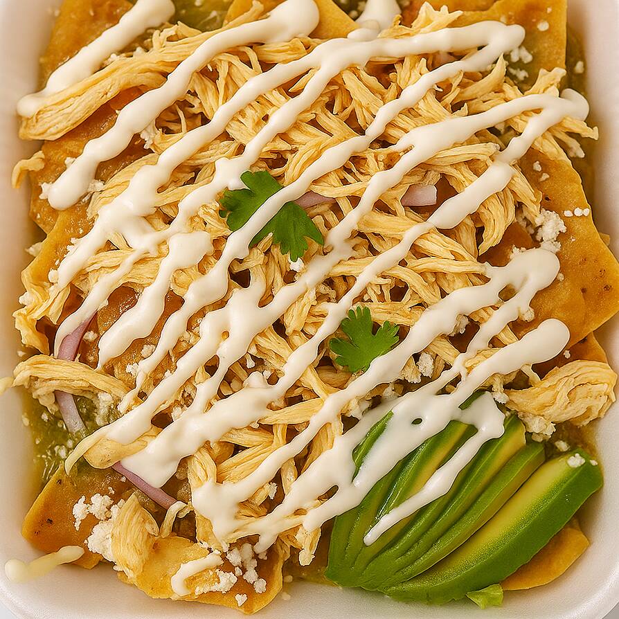 Rojos o verdes con pollo deshebrado, servicio con queso ranchero, crema, y aguacate.