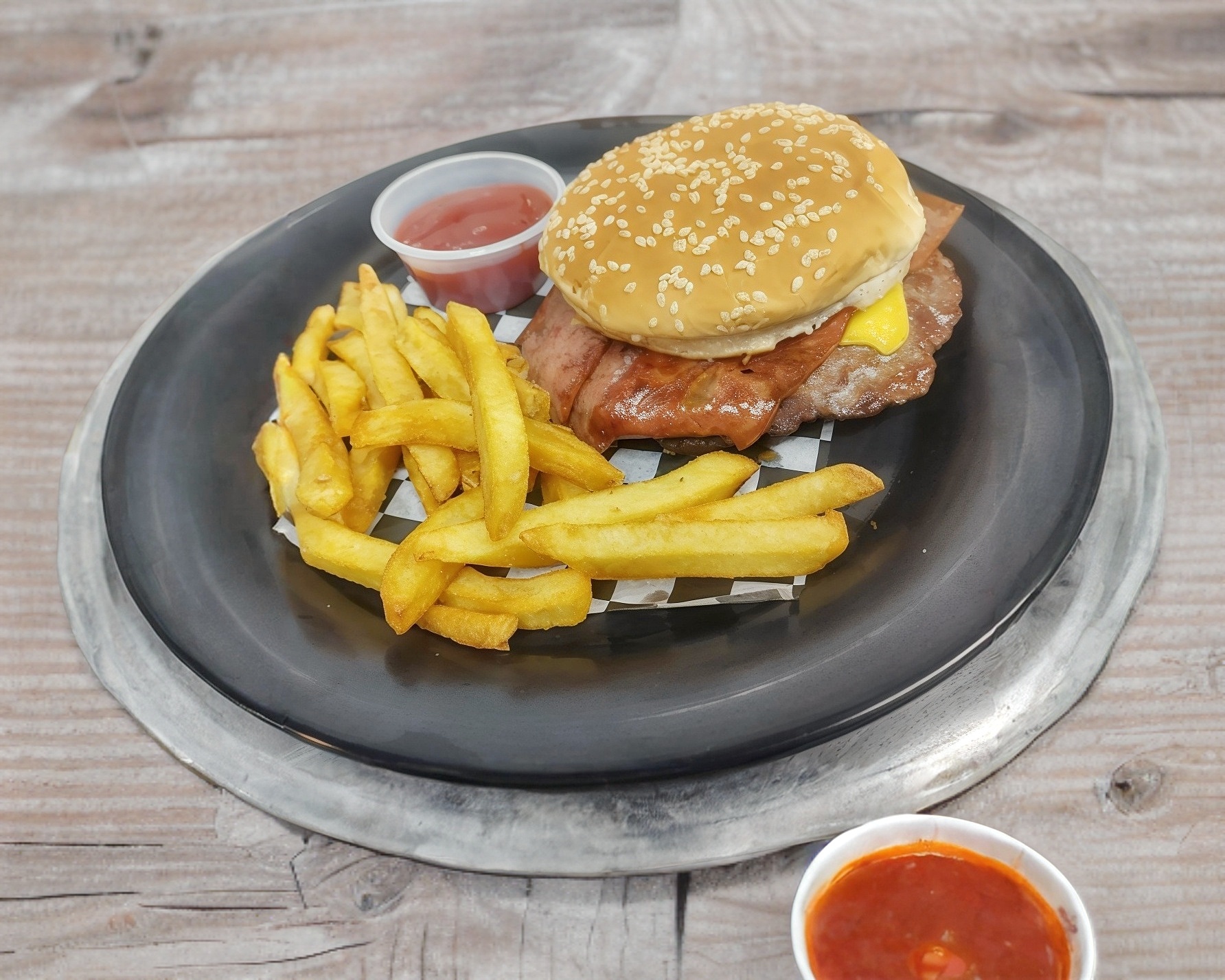 Carne tipo smash, pan brioche, tocino, queso amarillo, lechuga, jitomate y 100 gramos de papas.