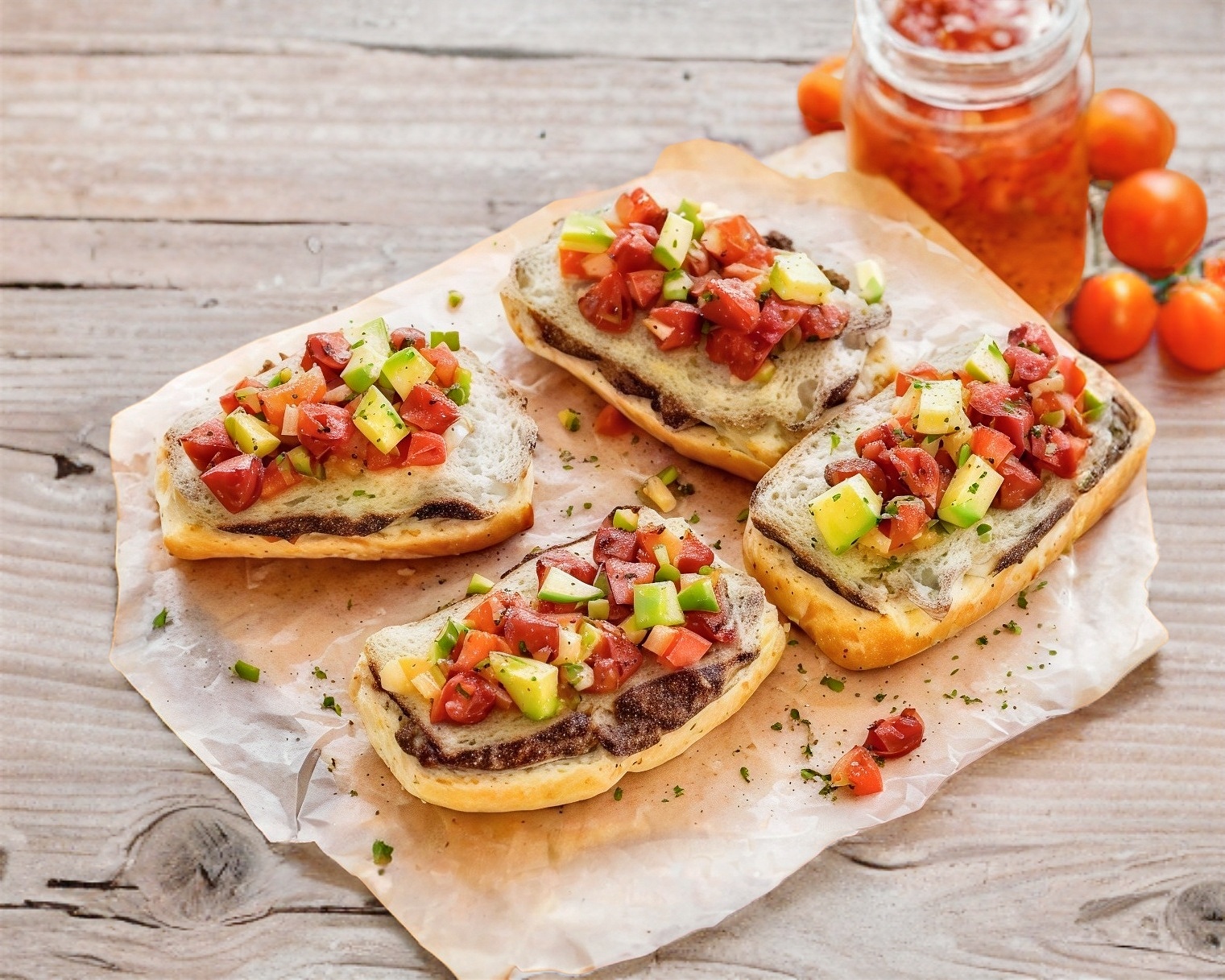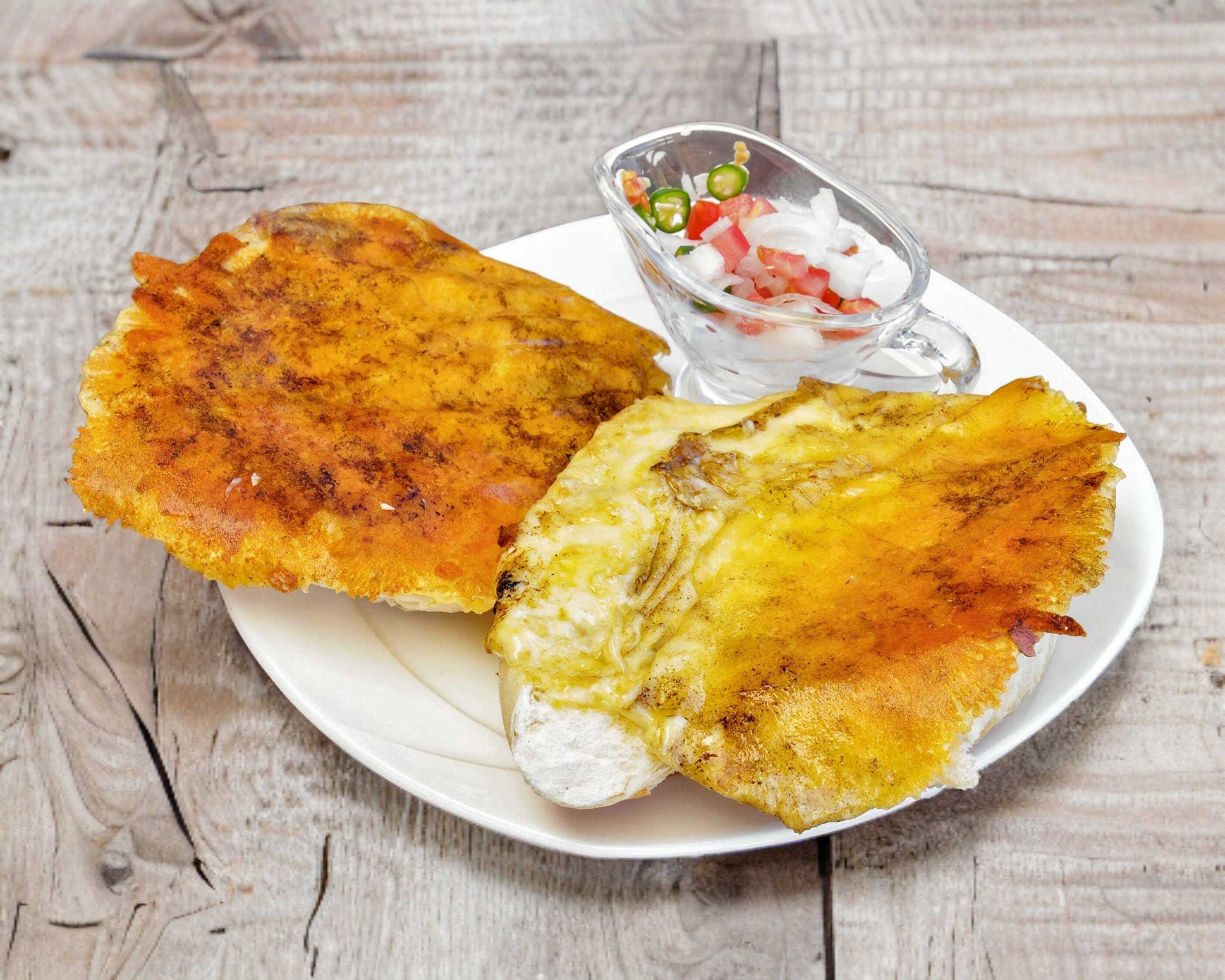 Par de molletes, preparados con frijolitos untados y costra de queso gouda, incluye pico de gallo.