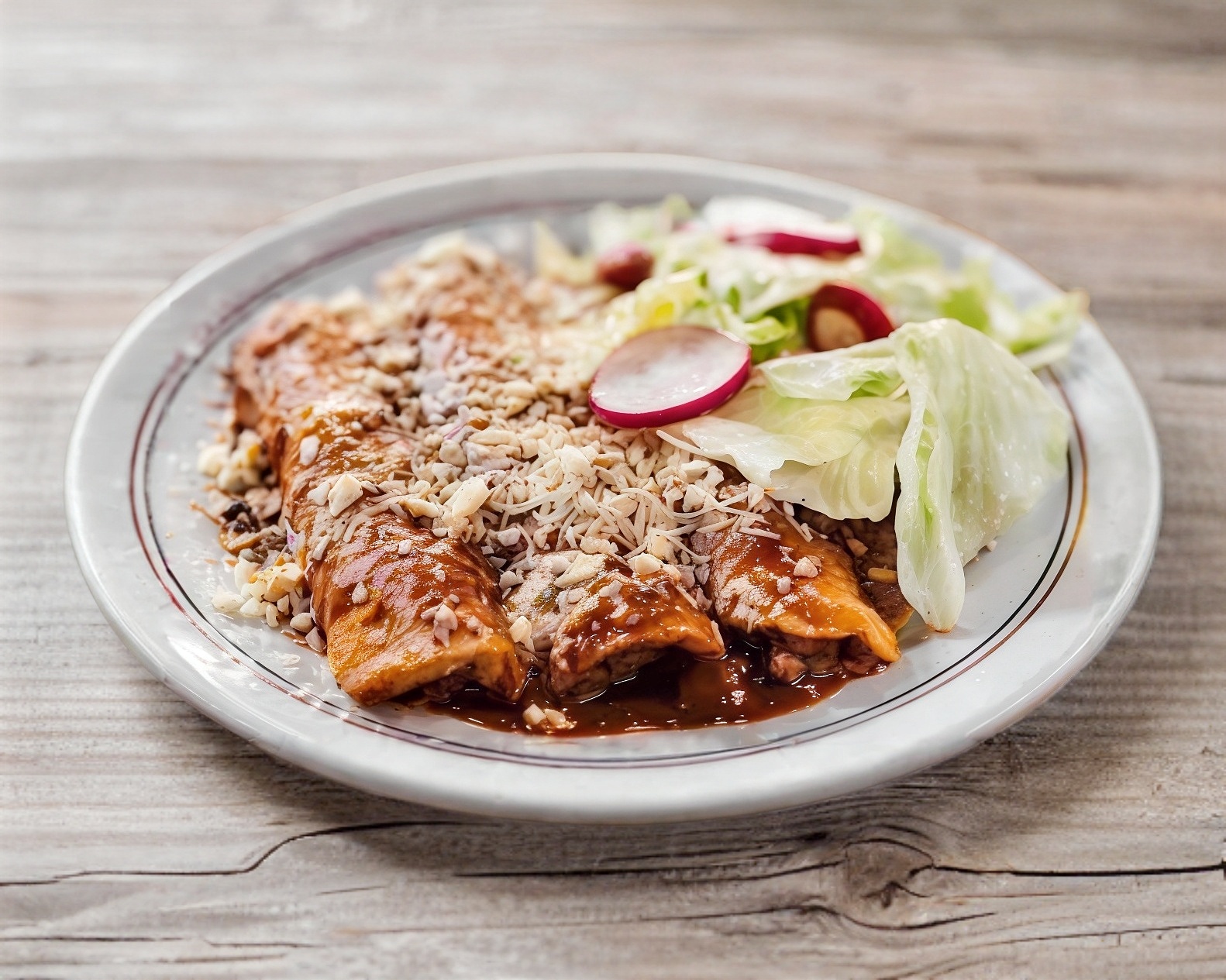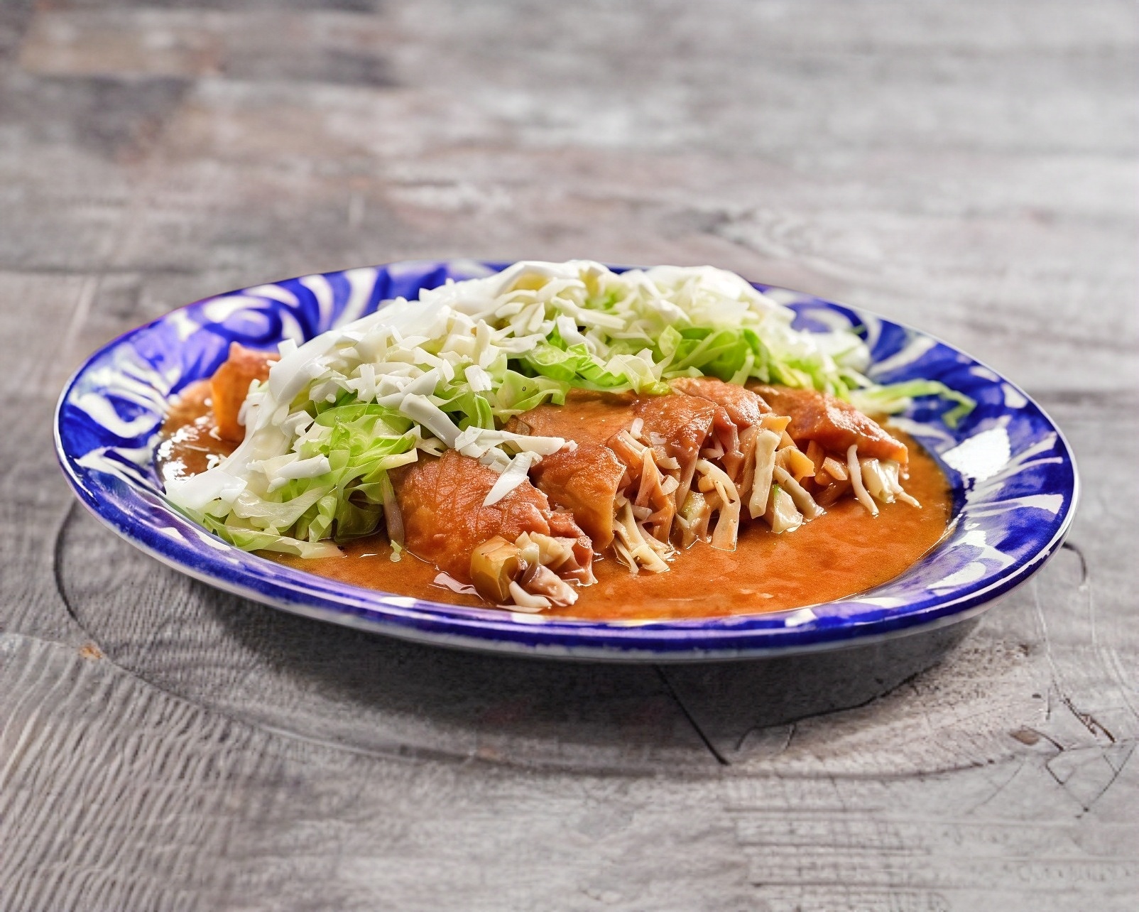 3 Piezas de enchiladas de pollo, agrega complementos y proteína de topping extra a tu elección.