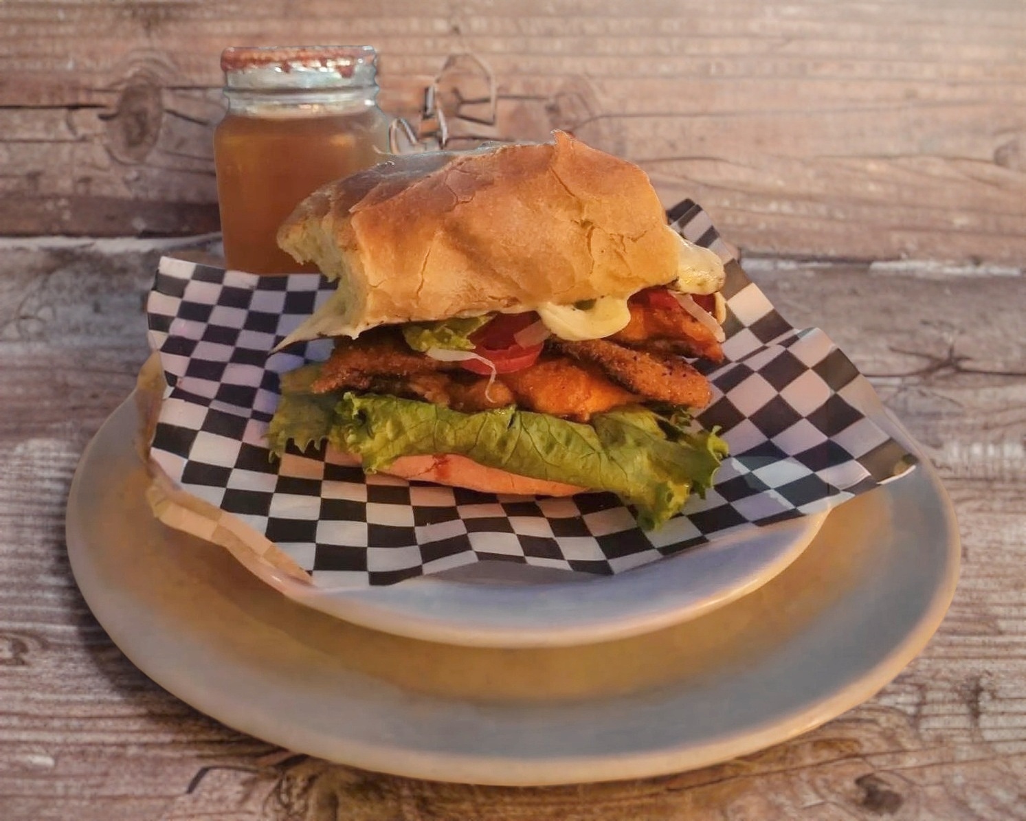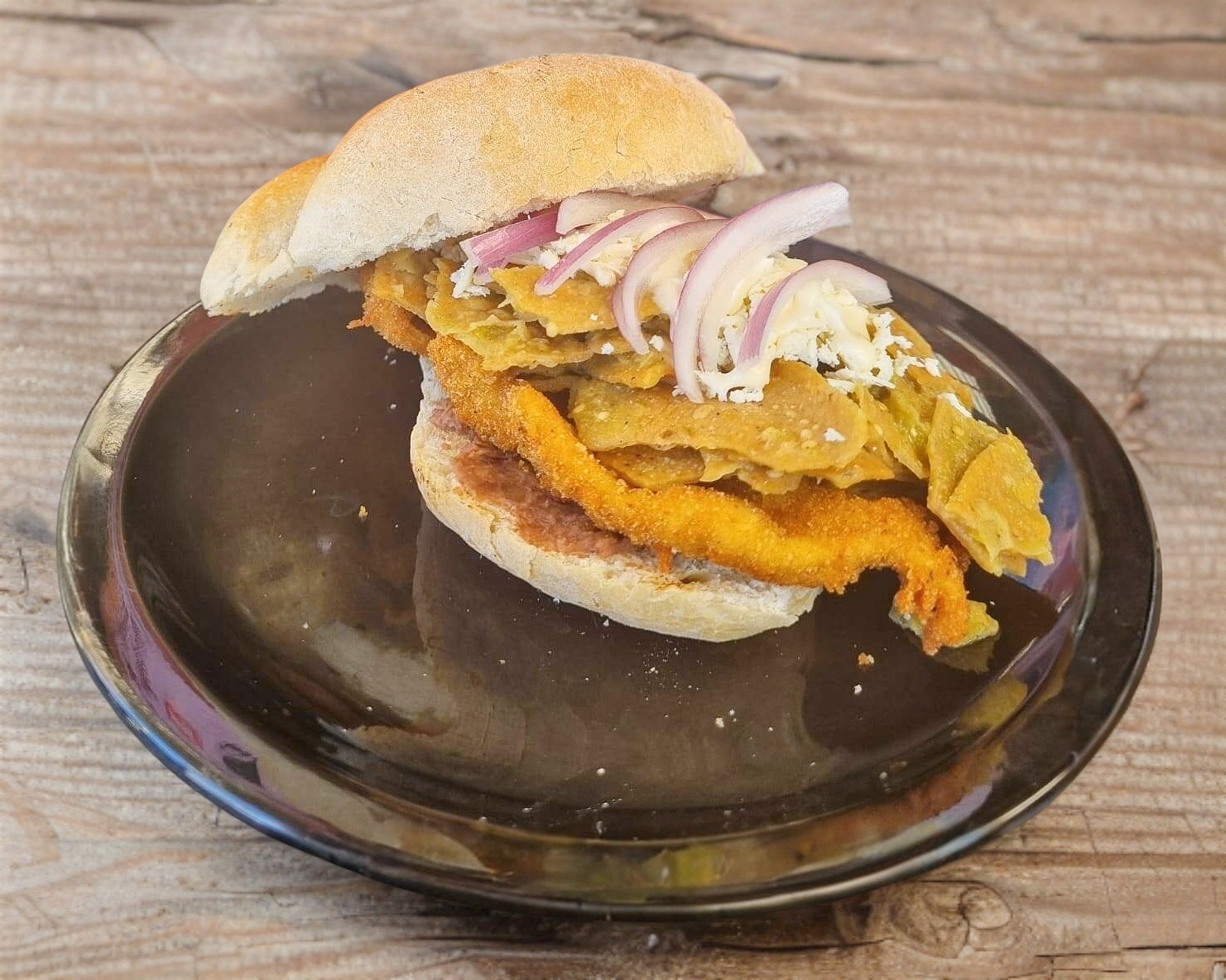 Lechuga, jitomate, mayonesa, frijoles, cebolla y milanesa de pollo.