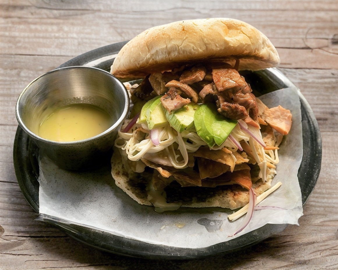 Arrachera, costra de queso gouda, aguacate, cebolla curtida y aderezo mayo chipotle.