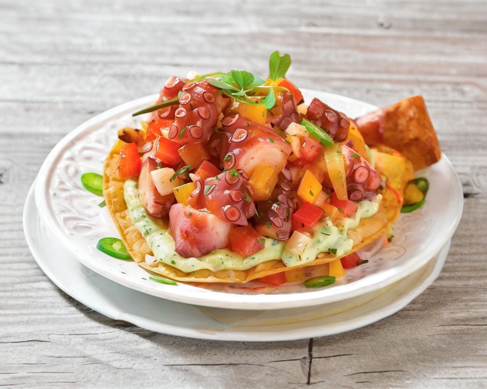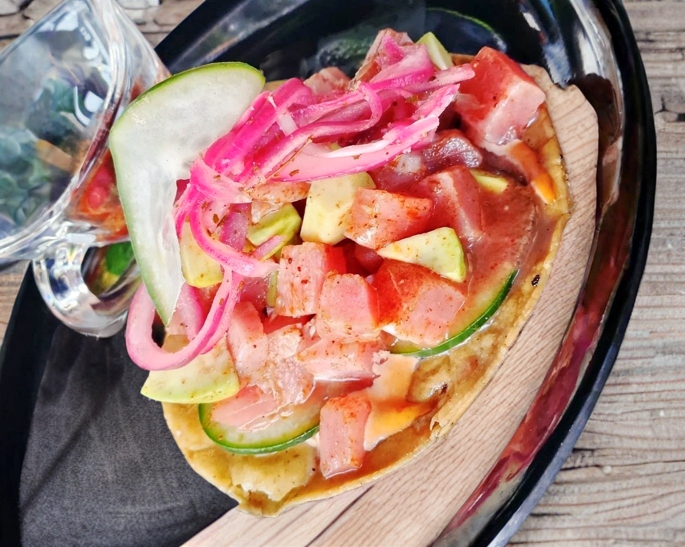 Tostada de camarón en salsa de aguachile verde.