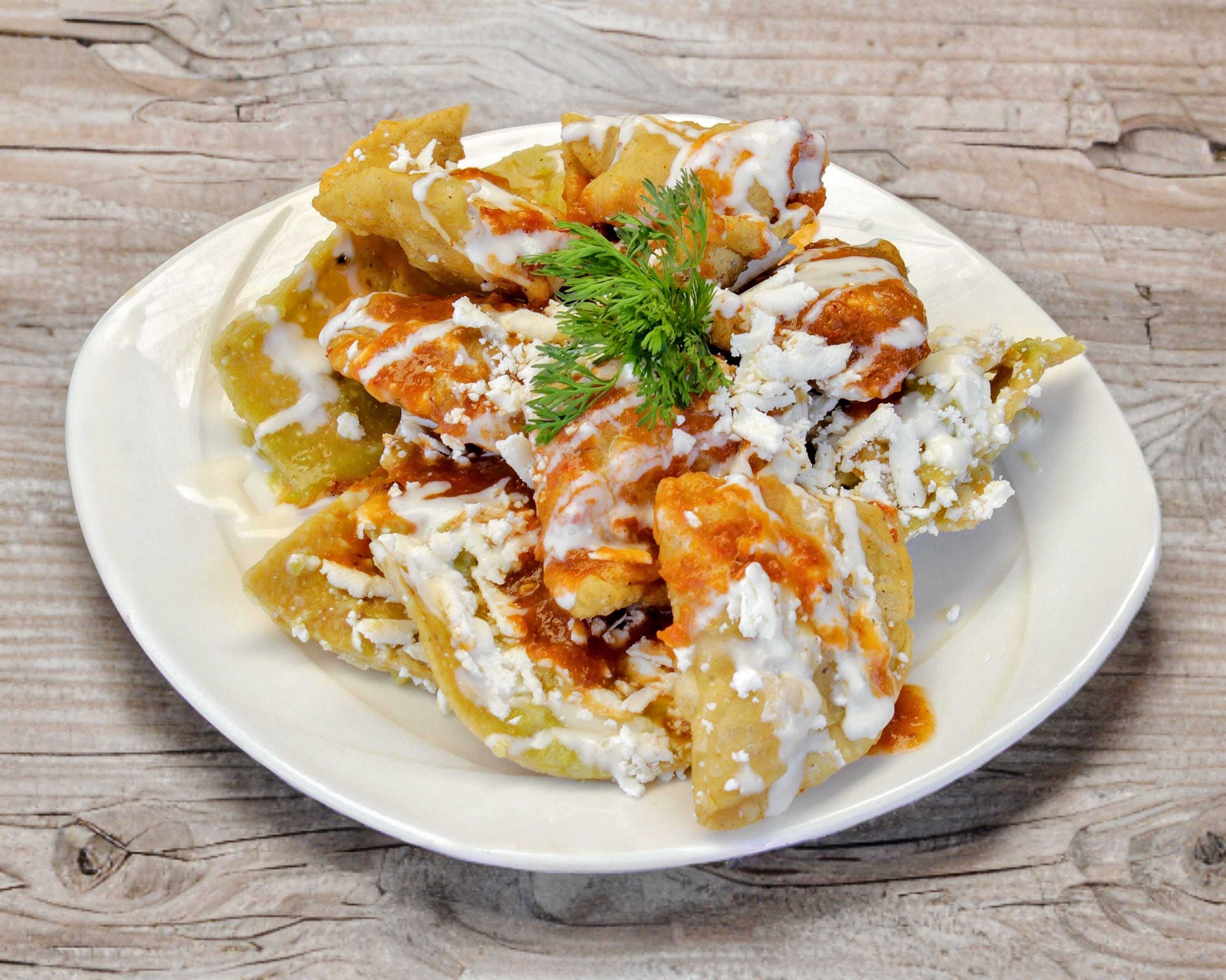 6 Deliciosos chilaquiles rellenos de tu elección, ideales para que no te quedes con el antojo, preparados con queso añejo y crema.