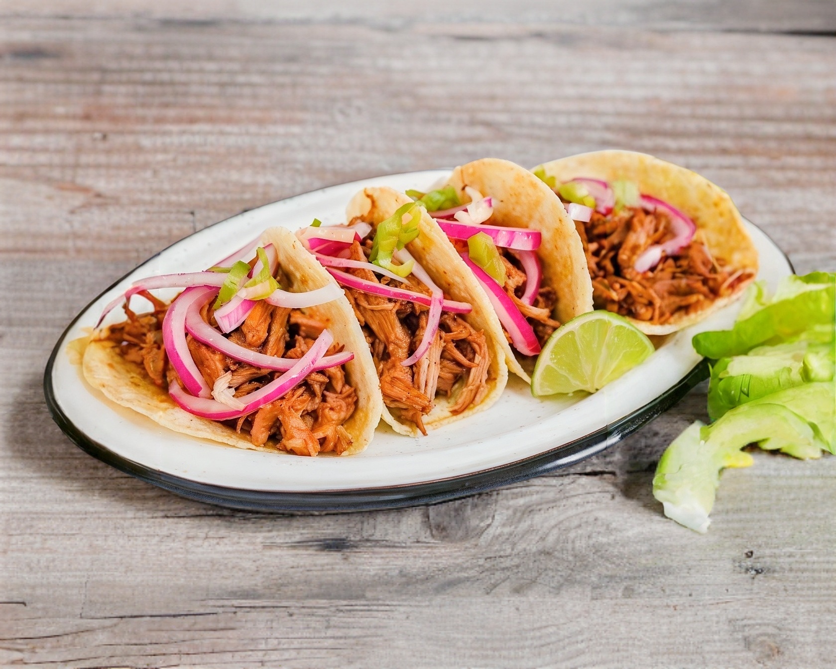 3 Deliciosos tacos de cochinita, incluye cebolla curtida y salsa habanero a parte.