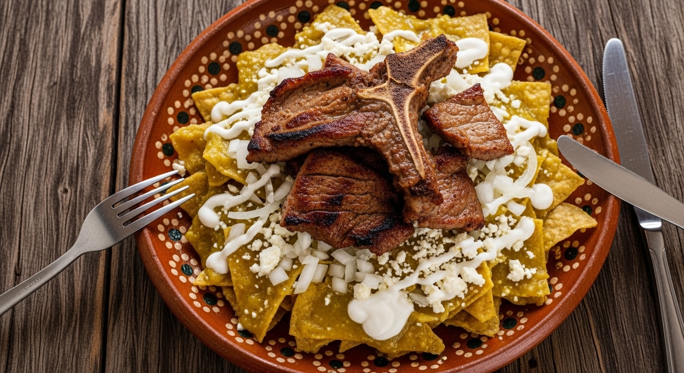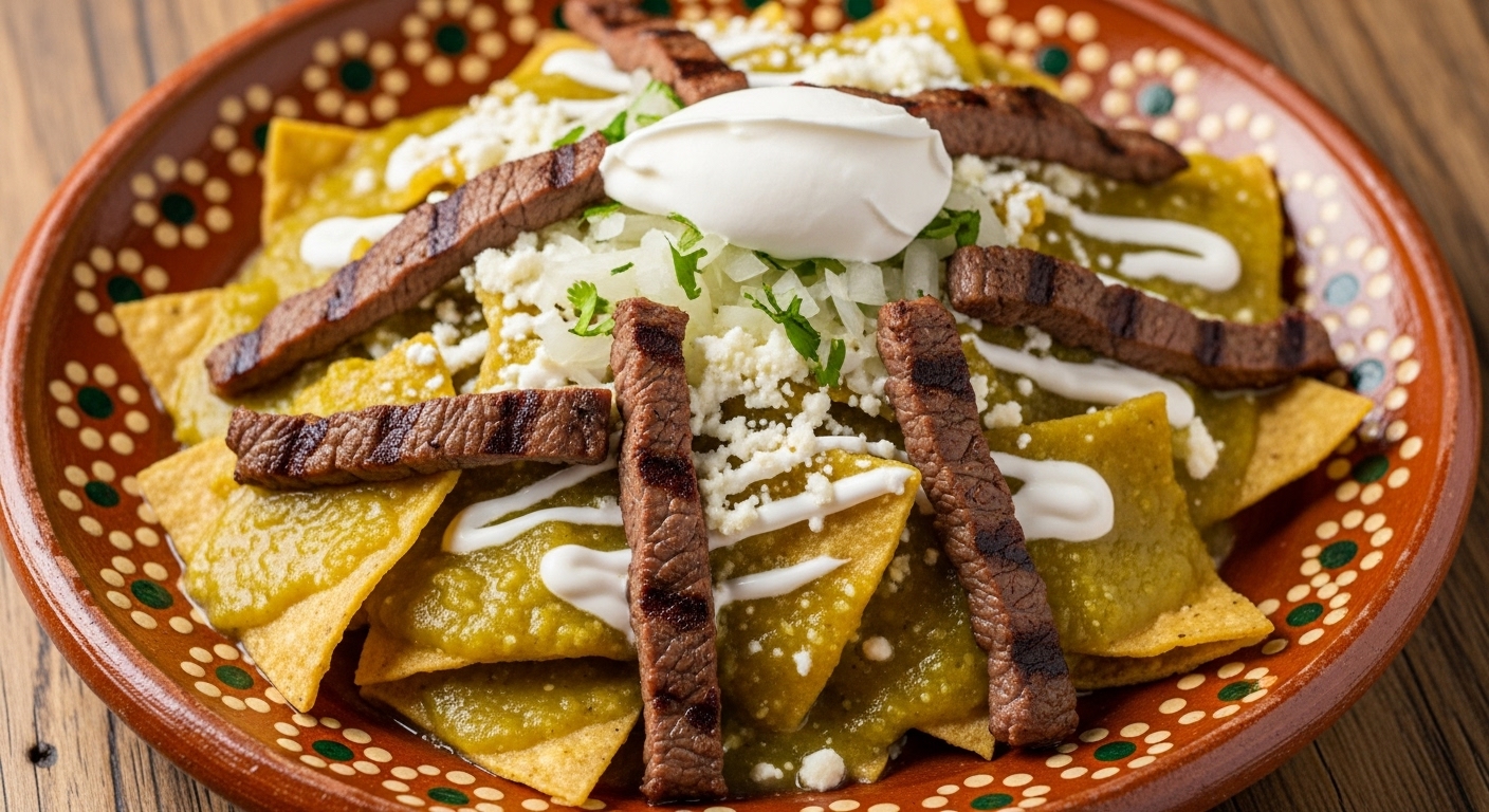 Deliciosos chilaquiles tradicionales bañados finamente con salsa a elegir, acompañados de bistec asado.