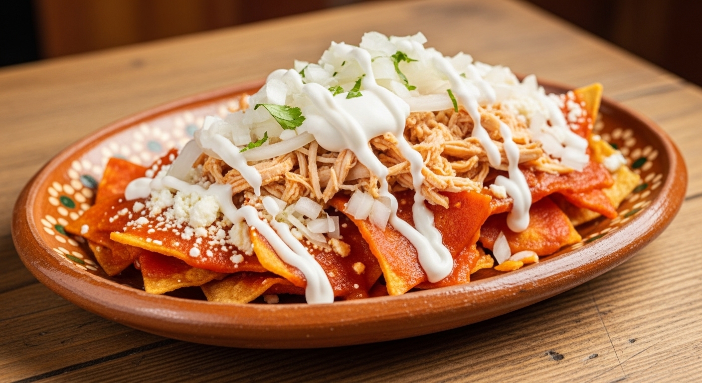 Deliciosos chilaquiles tradicionales bañados finamente con salsa a elegir, acompañados de pollo jugoso.