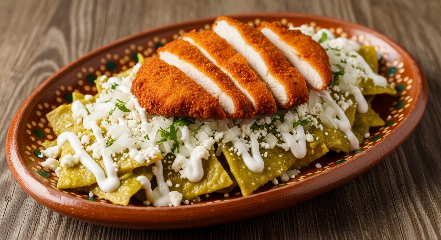 Deliciosos chilaquiles tradicionales bañados finamente con salsa a elegir, acompañados de milanesa frita y proteína extra a elección.