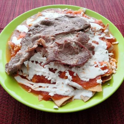 chilaquiles rojos con Bistec