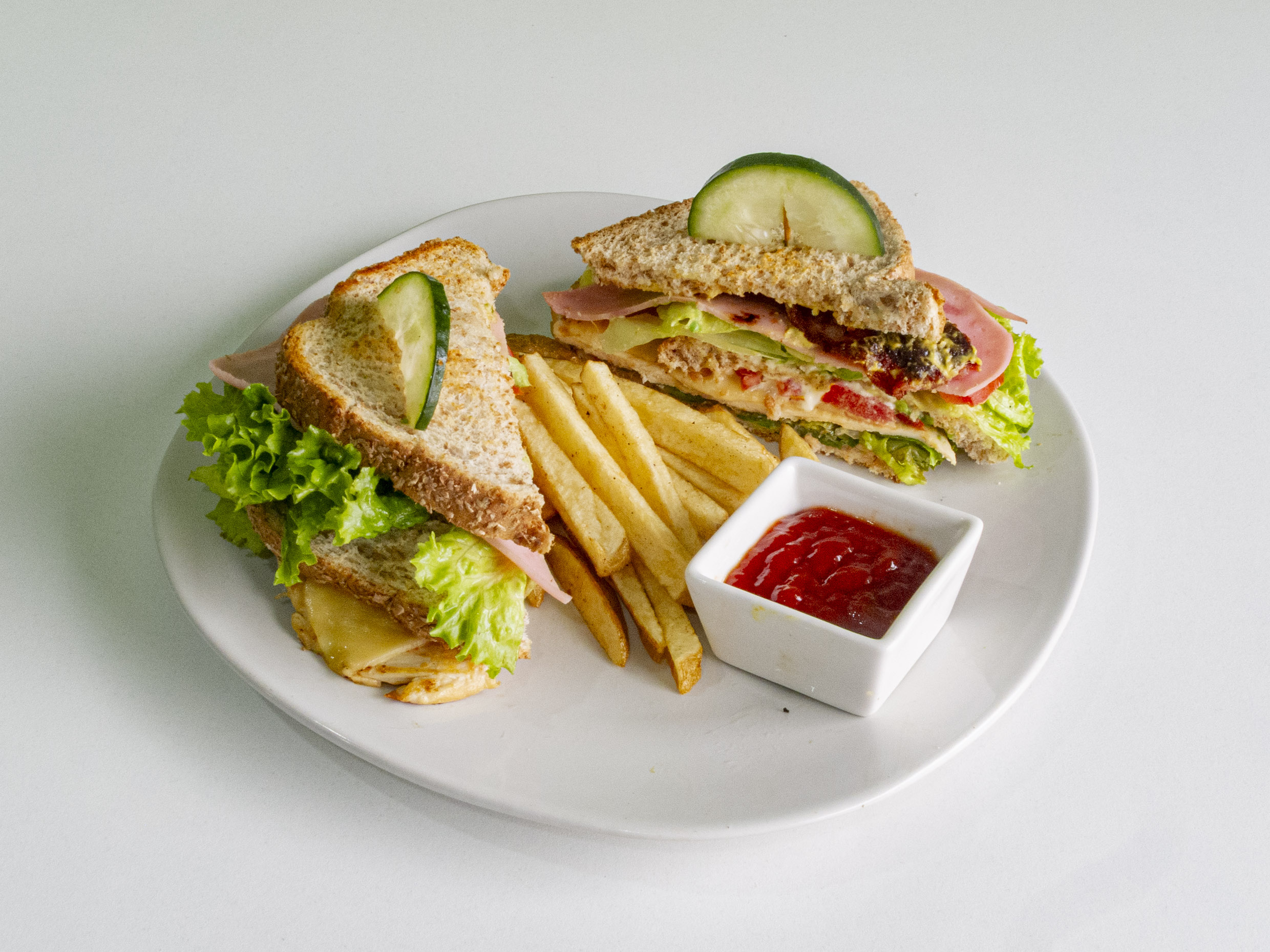 3Pzs de pan, pechuga, jamón, queso mamchego y papas a la francesa (lechuga, jitomate, aguacate)
