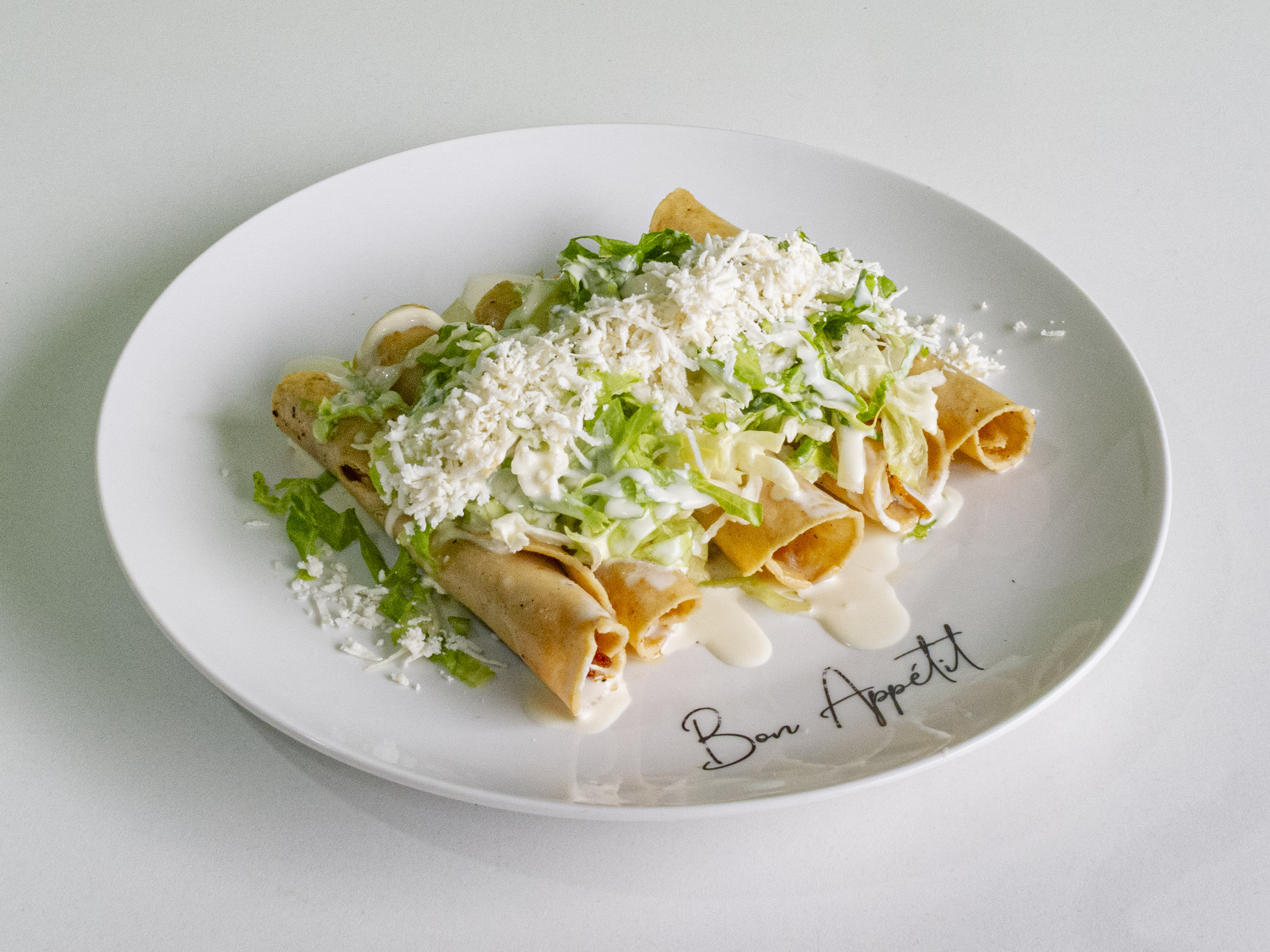 5 taquitos dorados de pollo acompañados de lechuga, crema y queso.