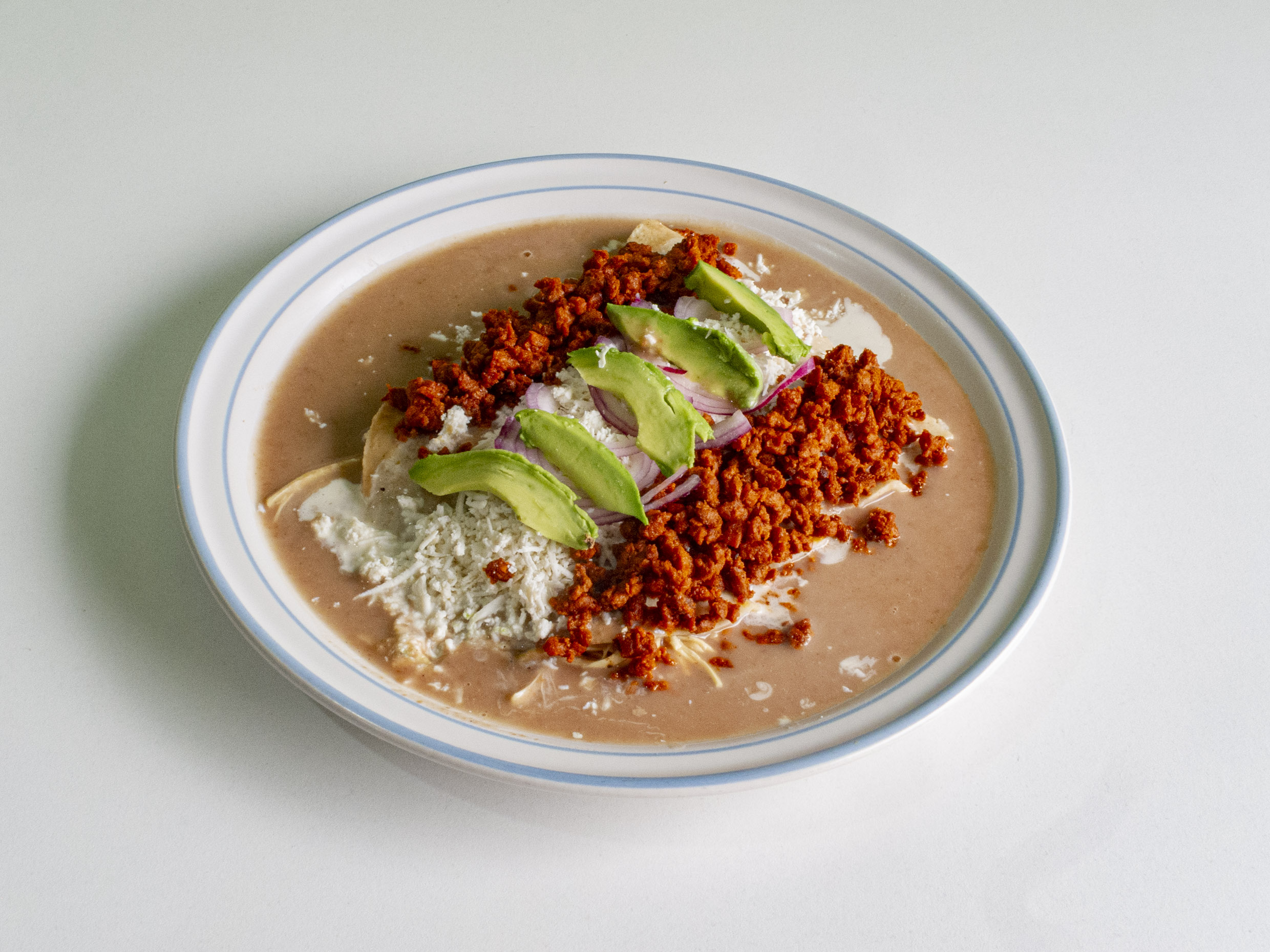 Frijoles, totopos, salsa, crema, queso, cebolla, aguacate y proteína a elegir.