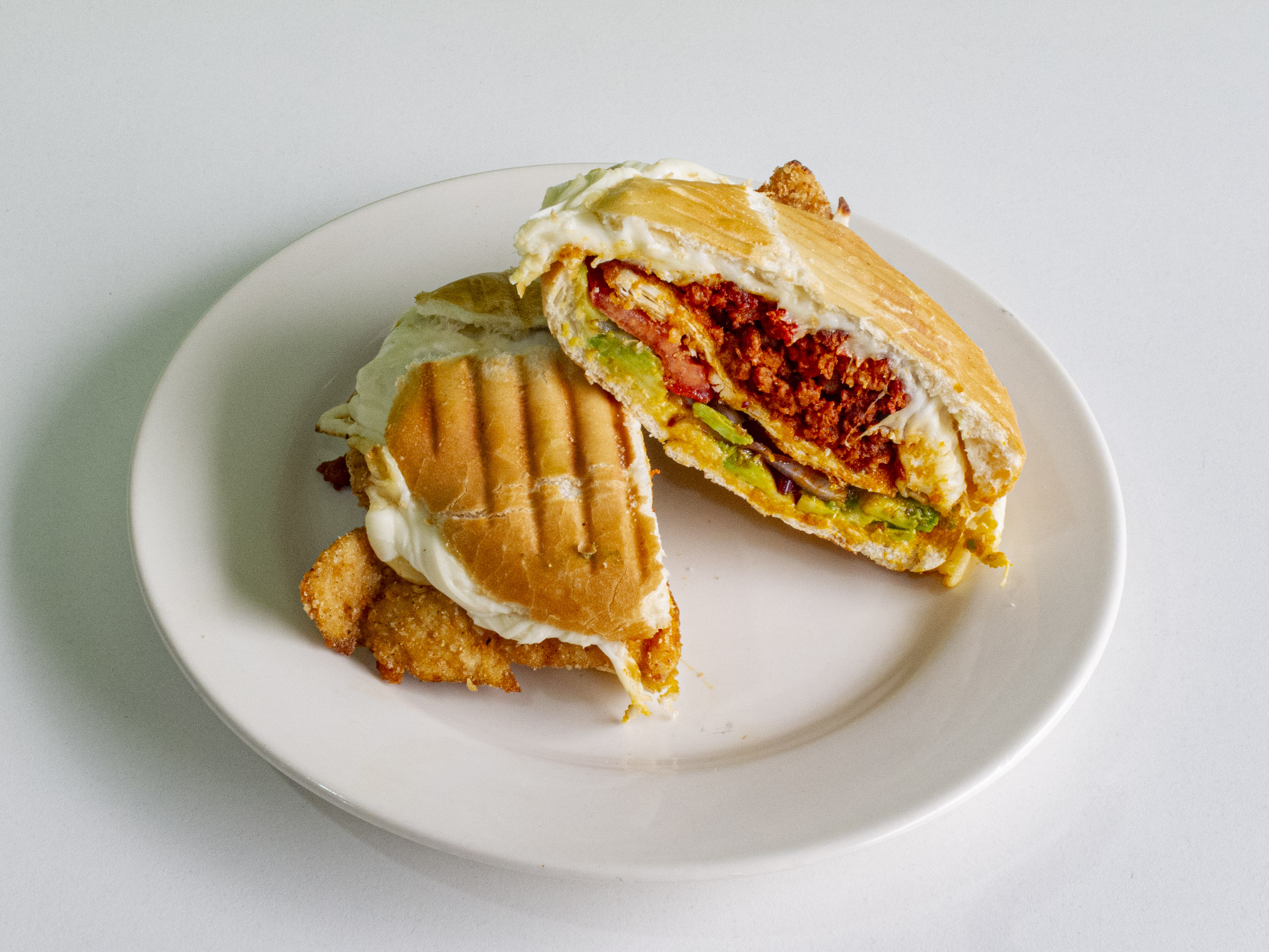Sándwich de la casa acompañado de frijoles, mayonesa, lechuga, jitomate, aguacate, queso manchego y proteína de su elección