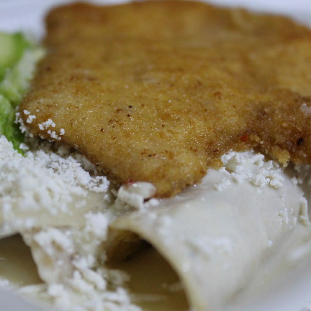 Totopo bañado en salsa de su elección, queso, crema, cebolla y proteína a elegir. Incluye pan de sal.