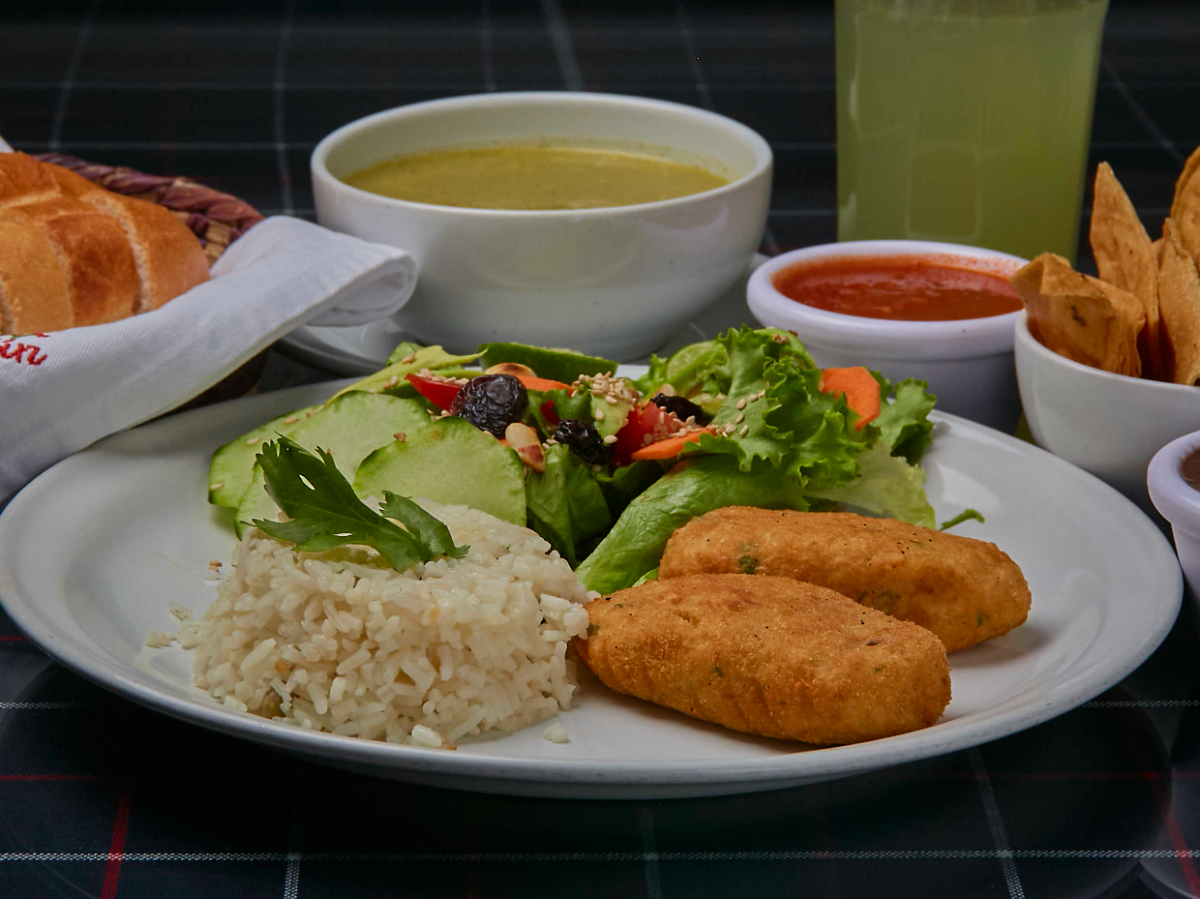 Platillo individual incluye agua del día, elige un postre y un segundo tiempo a elegir, un acompañante y una proteína.