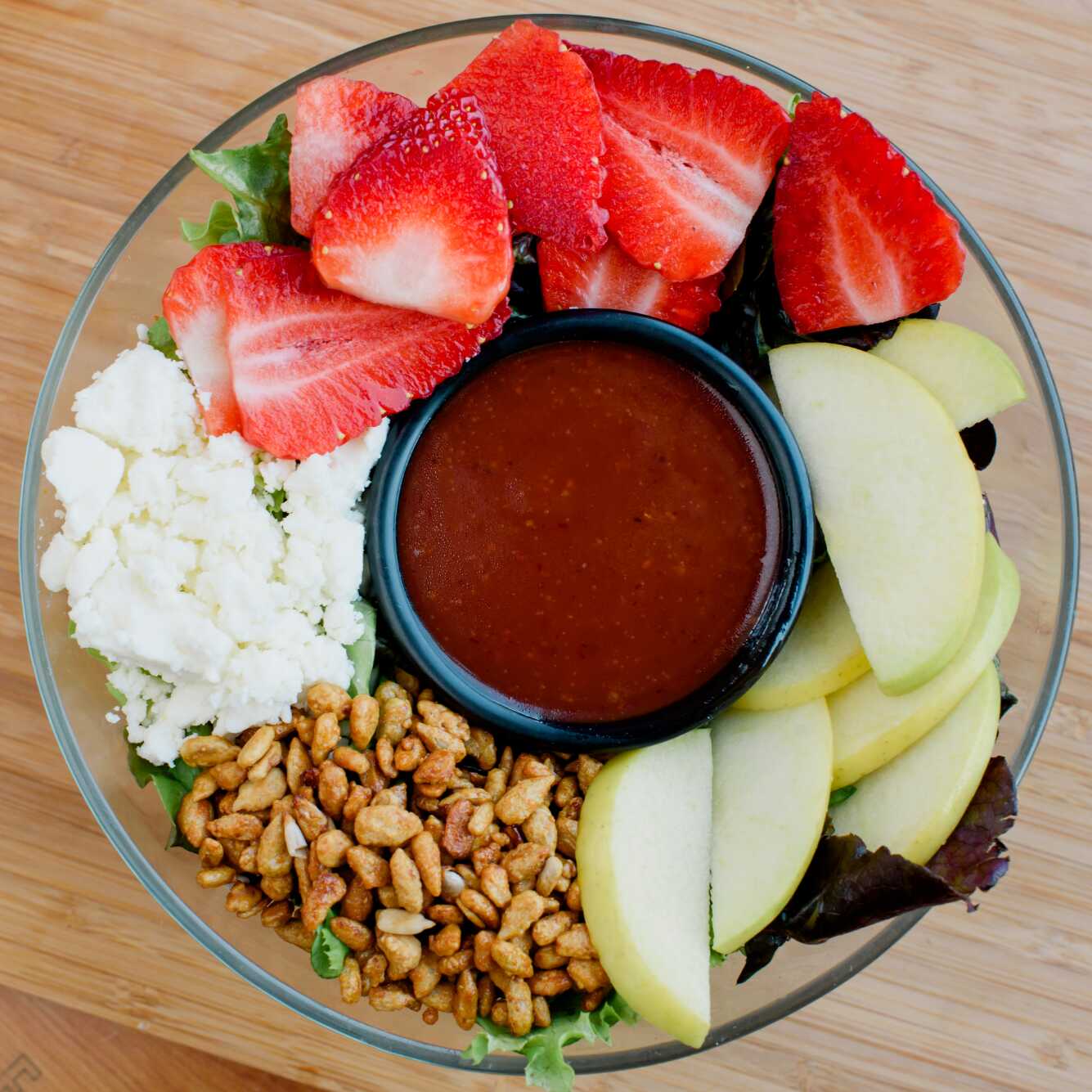 Fresa, manzana, queso de cabra, semilla de sésamo caramelizada, mezcla de lechugas y vinagreta de raspberry spicy.