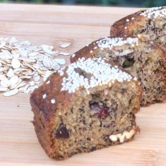 Panqué de plátano con harina de avena, arándanos y nuez