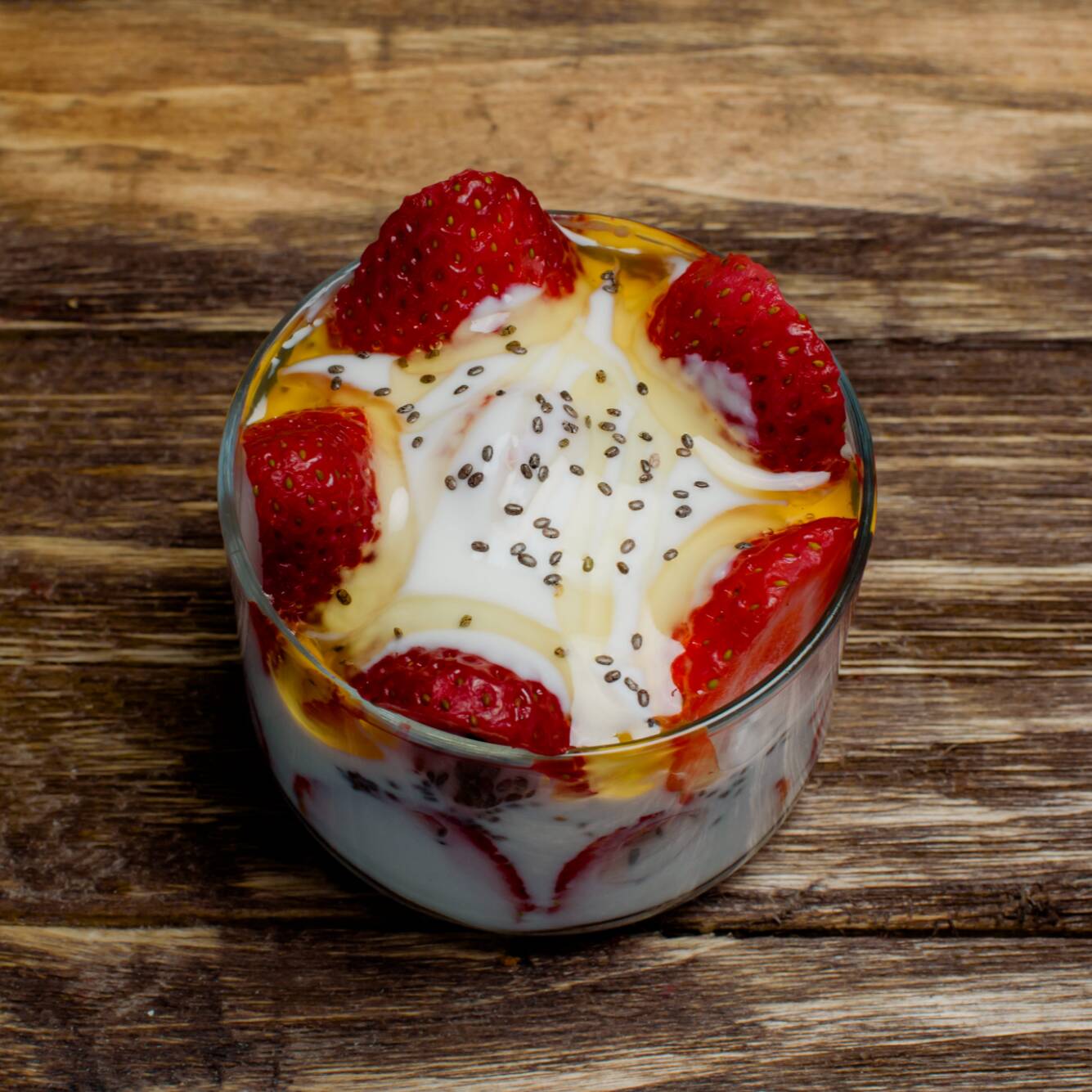 Copa de Fresas mezcla de yogurt, miel y chía.