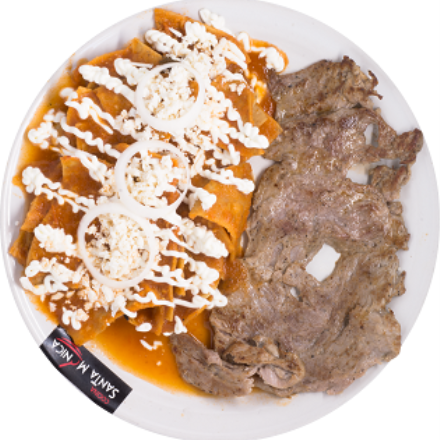 Chilaquiles con arrachera. Incluye sopa , arroz o pasta, agua del día y postre.