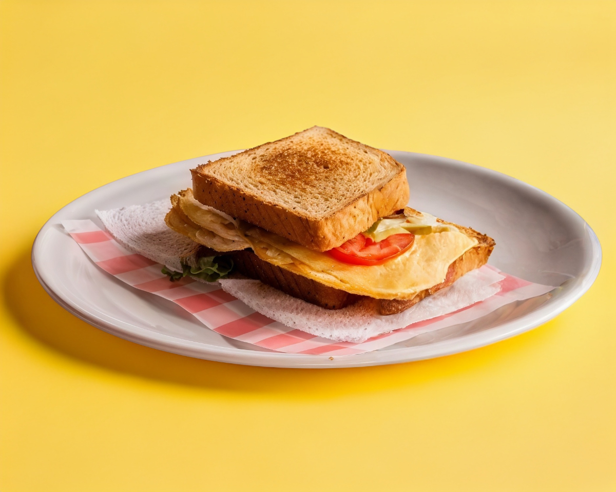Sándwich con pan integral, pechuga de pollo asada, queso gratinado lechuga, jitomate y aguacate. Incluye café, jugo, fruta y pan dulce.