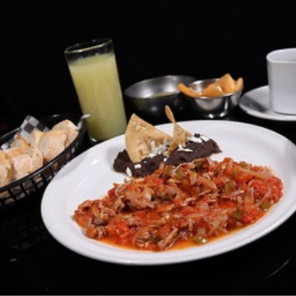 Molletes, puntas de filete a la mexicana y chilaquiles. Incluye café, jugo, fruta y pan dulce.