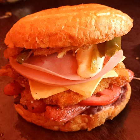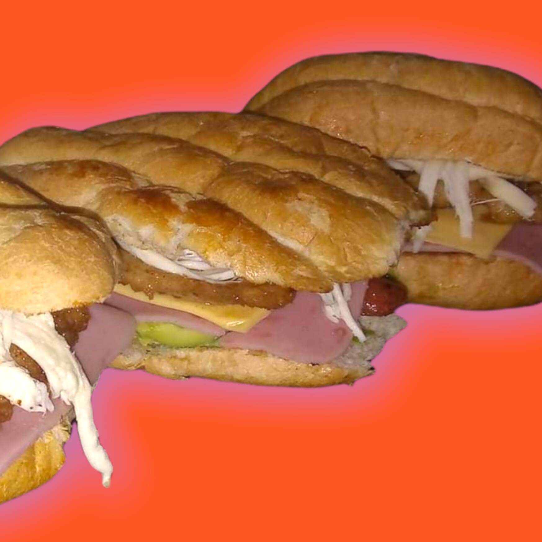 PECHUGA DE POLLO EMPANIZADA +200 gms de carne mixta acompañada de tocino queso americano y jamón+ lechuga cebolla capsu mostaza mayonesa rajas