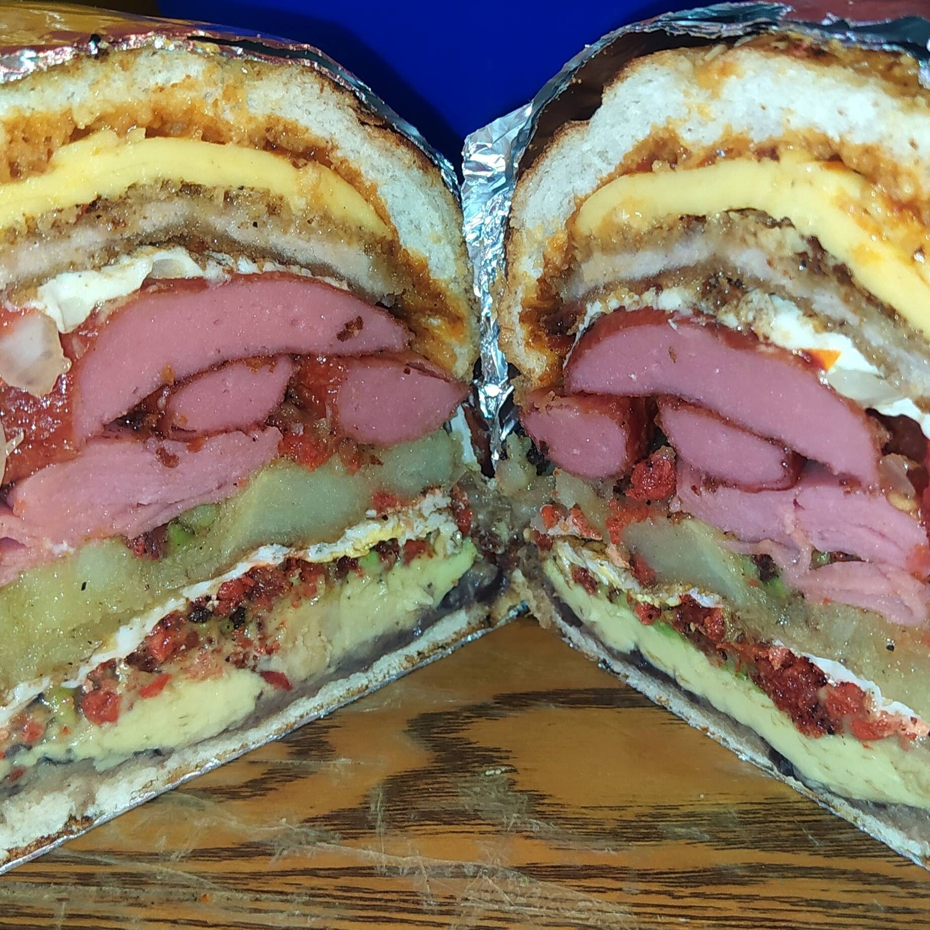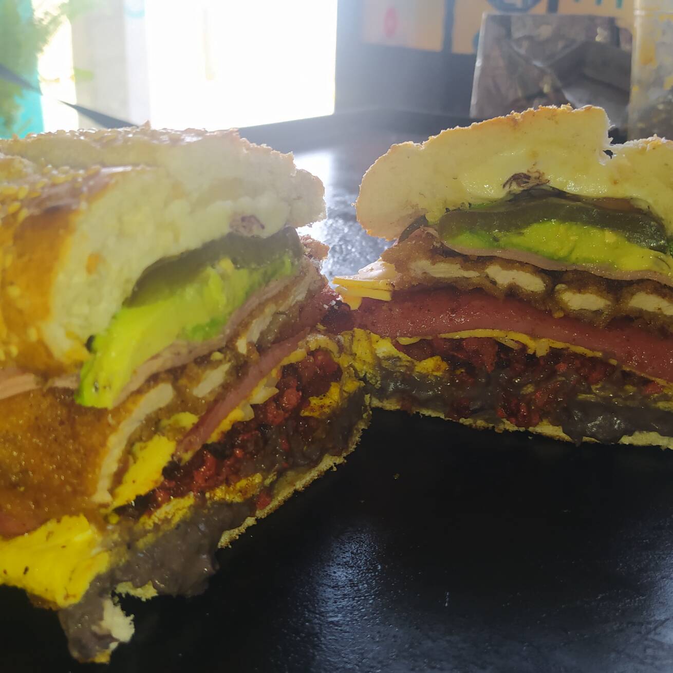Torta gigante preparada con jamón jitomate aguacate frijoles papita quesillo rajas o chipotle
