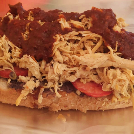TORTA CHICA DE PECHUGA DESHEBRADA,QUESILLO,JITOMATE,CEBOLLA,AGUACATE,FRIJOLES REFRITOS,RAJAS O CHIPOTLES