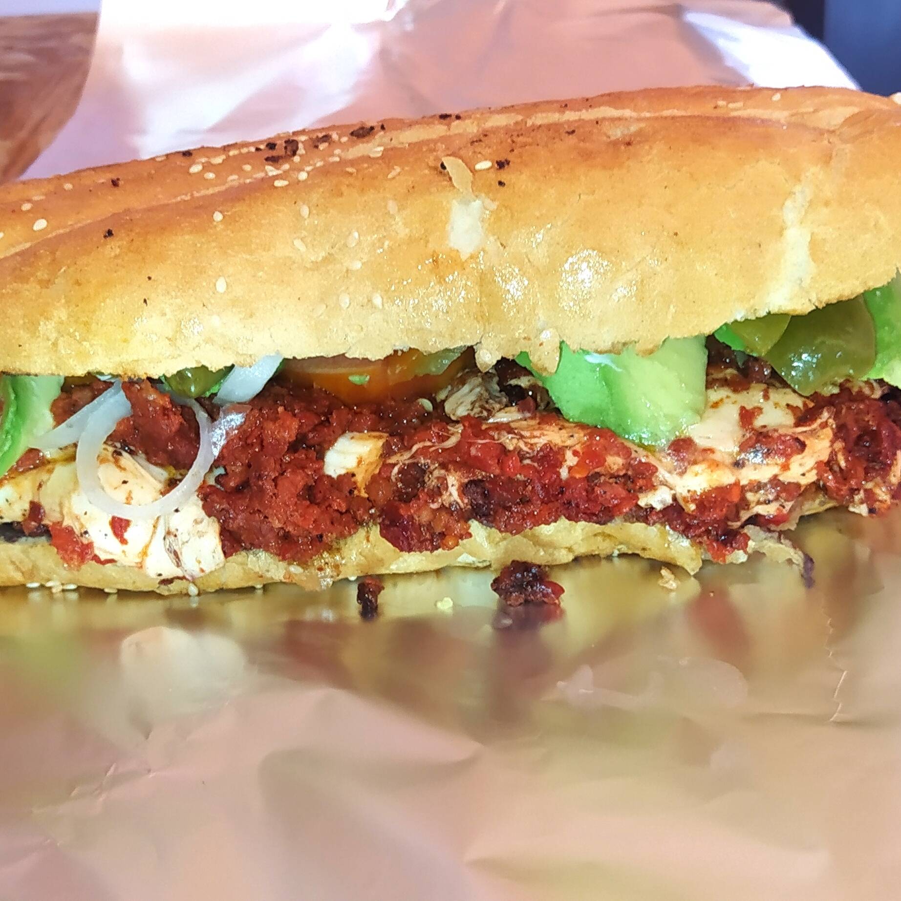 TORTAS CH DE CARNE ENCHILADA ,QUESILLO,FRIJOLES AGUACATE JITOMATE CEBOLLA RAJAS O CHIPOTLE