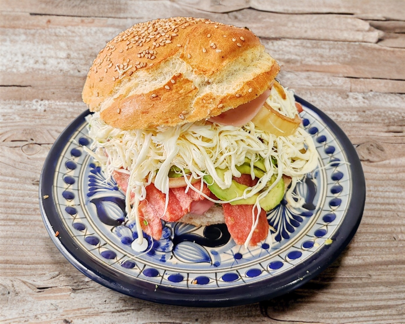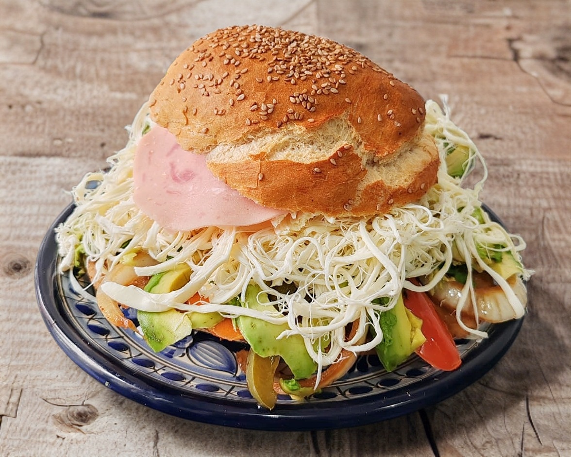 Cemita con salchicha, jamón, quesillo y aguacate.