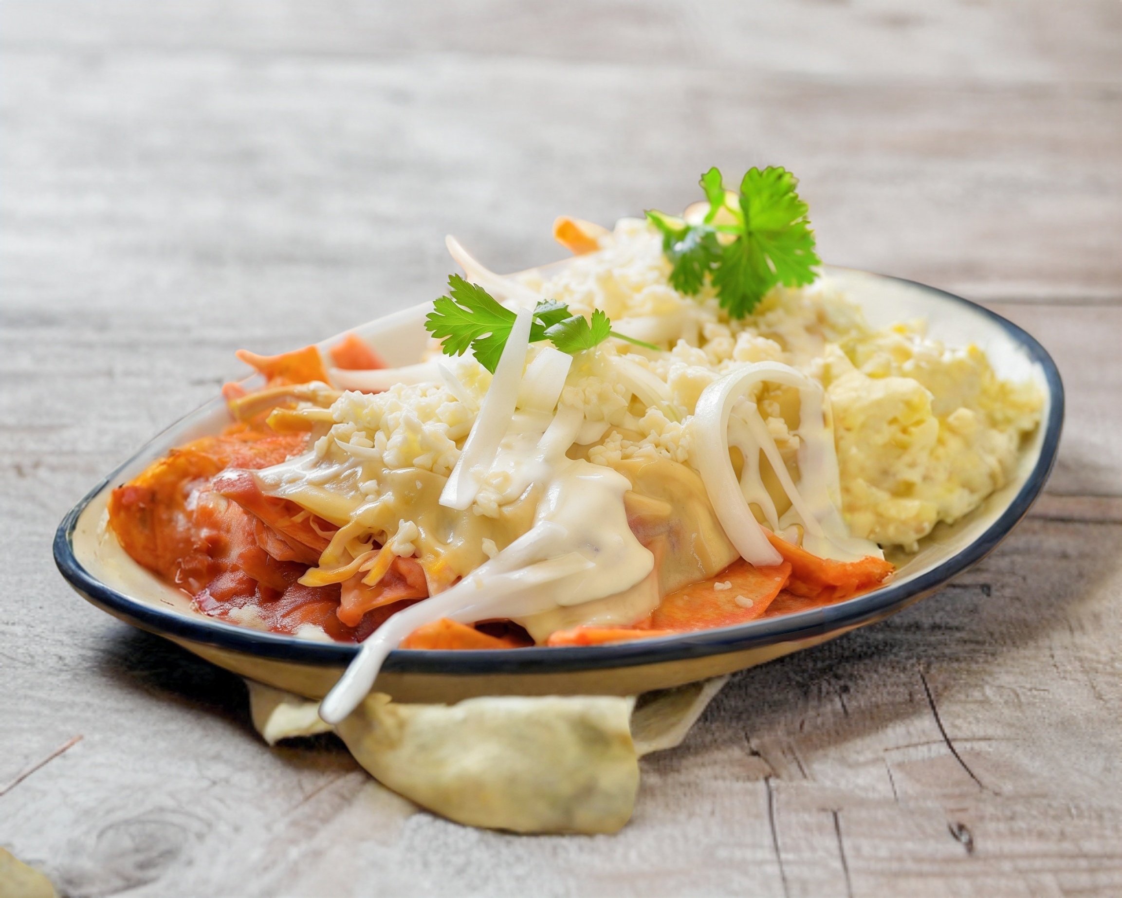 Chilaquiles con queso, crema y cebolla