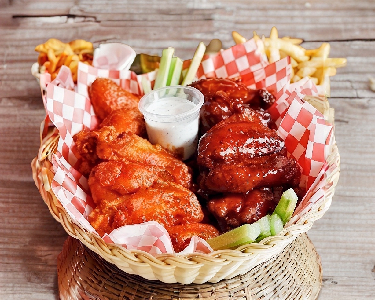 6 Alitas acompañadas de aderezo BBQ.
