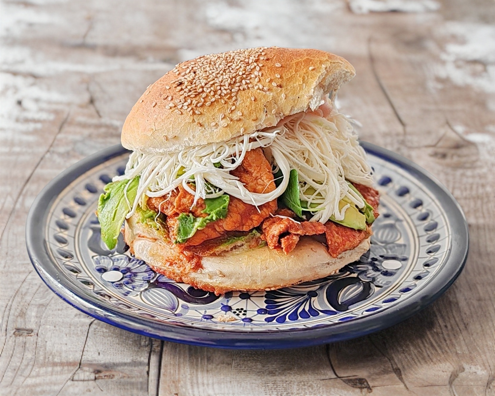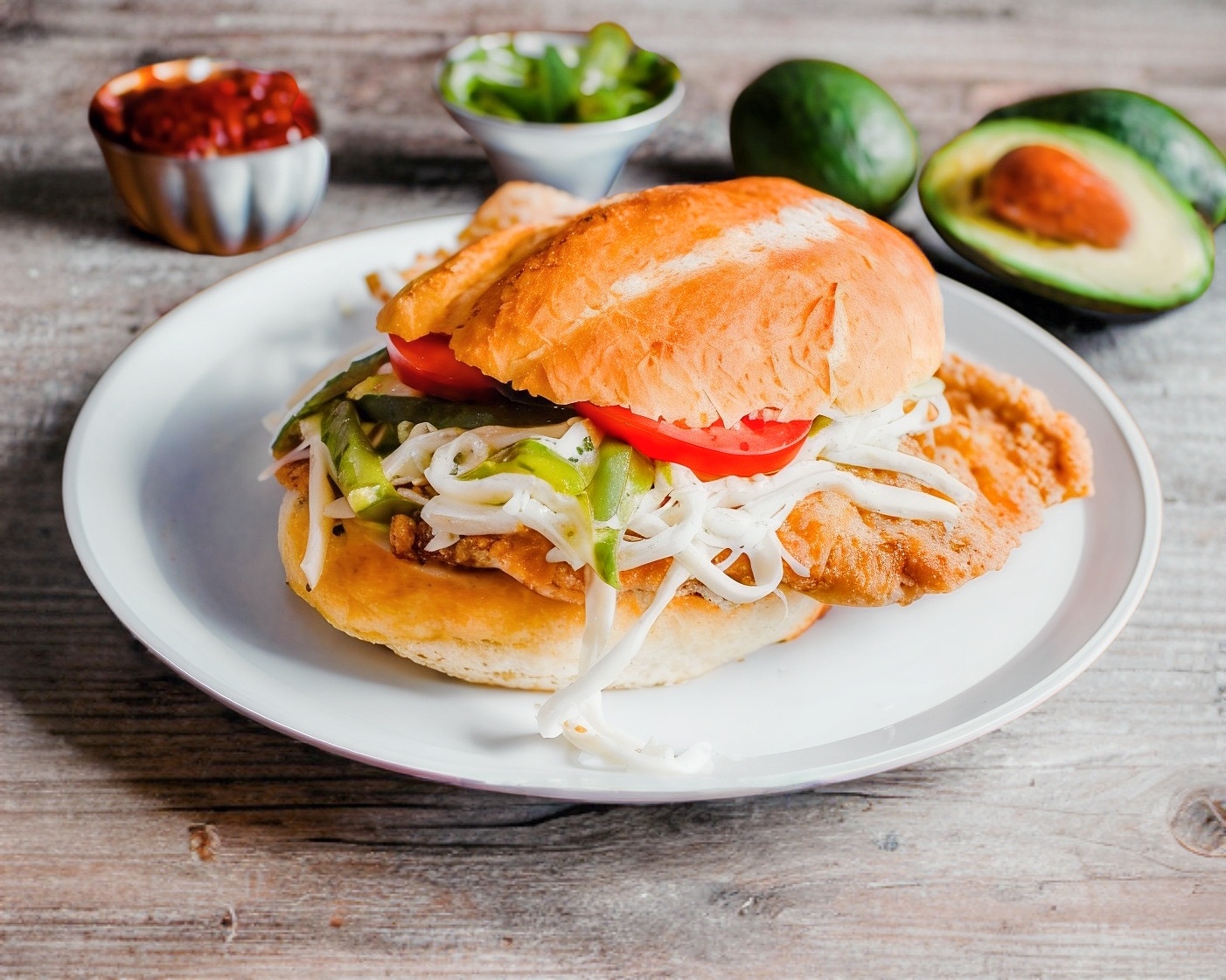 Cemita de milanesa con quesillo, aguacate, papalo, cebolla y (Rajas, Chipotle o Sin picante).