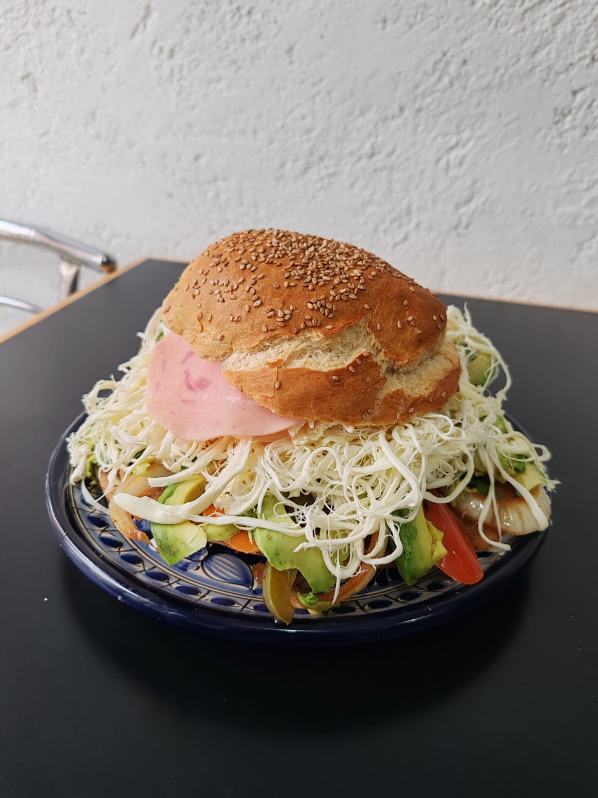 Torta de jamón y salchicha con frijoles y aguacate.