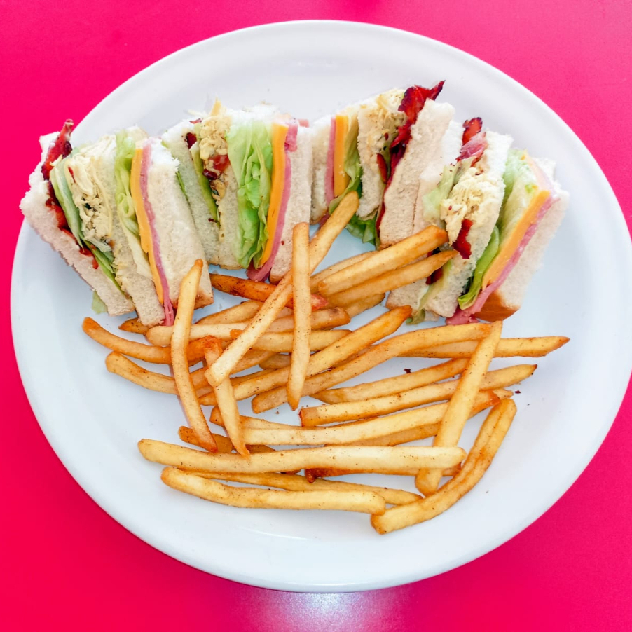 pan Blanco con jamon, pollo desebrado, tocino crujiente queso amarillo y paoas a la francesa