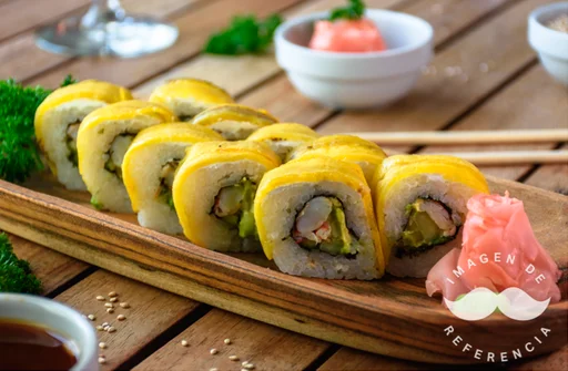ROLLO CUBIERTO DE MANGO,RELLENO DE CAMARON EMPANIZADO,AGUACATE,COCO Y QUESO CREMA