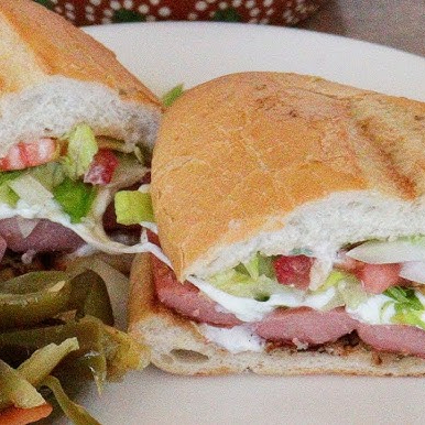 Sándwich planchado preparado con lechuga, jitomate, aguacate, frijoles, queso, pollo. Acompañado de papas a la francesa. (Incluye Agua del día)