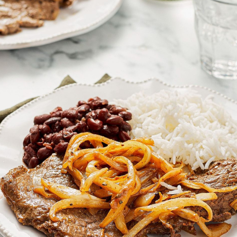 Bistec de cerdo con Guarnición, tortilla y agua del día.