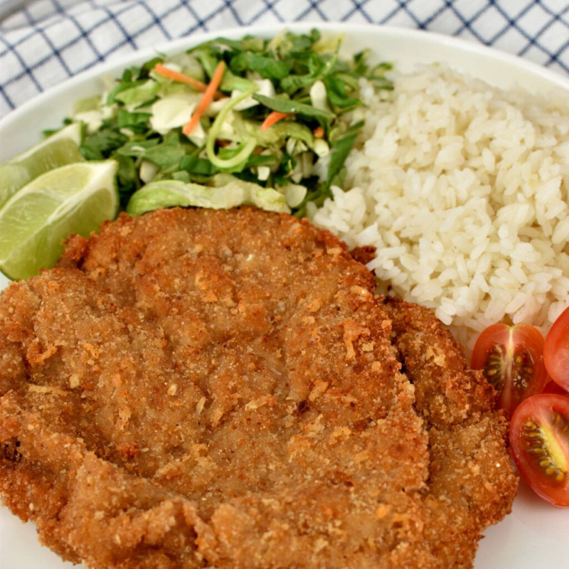 Milanesa de pollo o cerdo acompañada de ensalada y guarnición. Incluye Agua del día y Tortillas