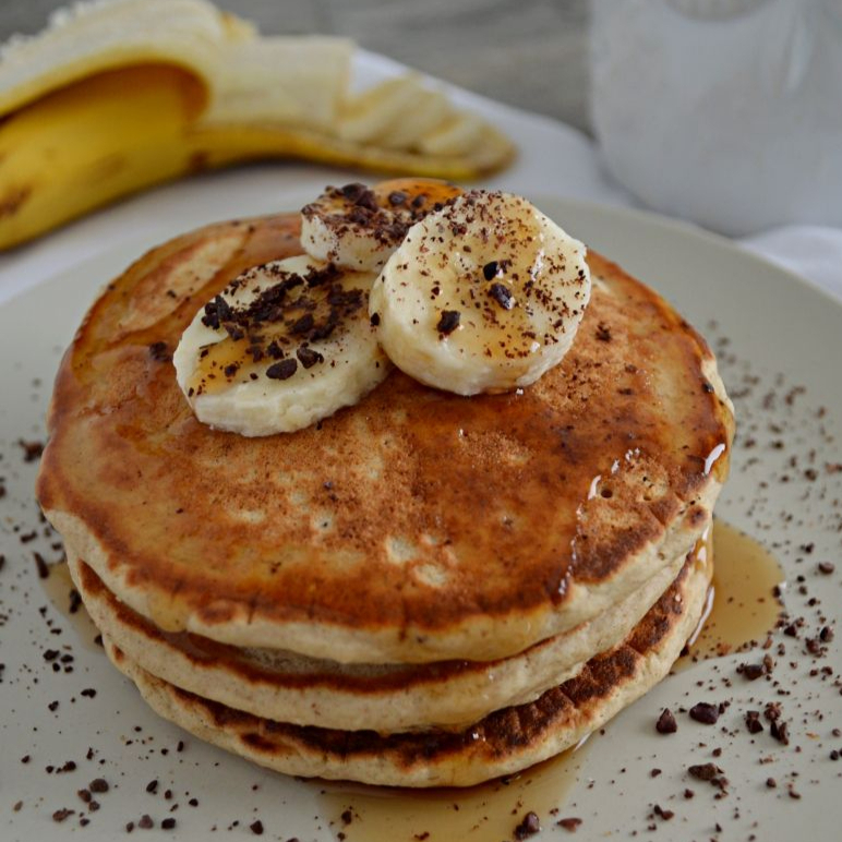 3 piezas de Hot Cakes, acompañados a tu elección. Incluye café de olla y fruta del día