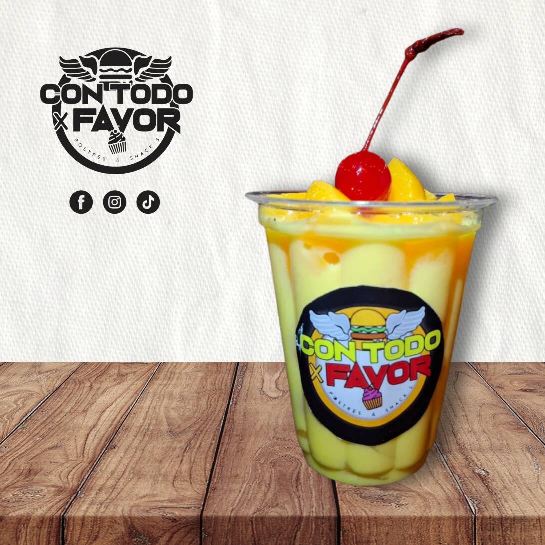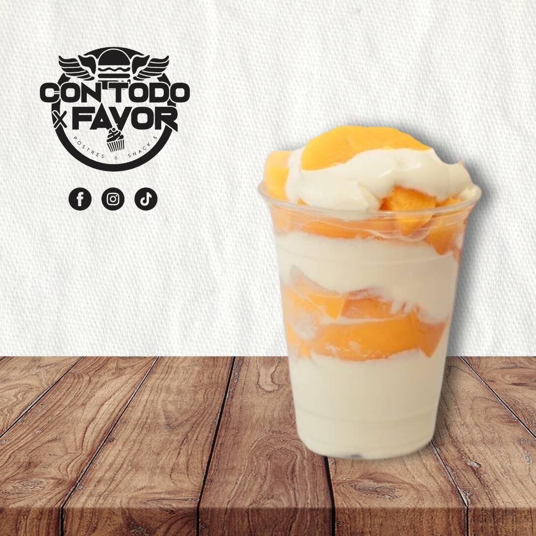 Cubitos de durazno en almíbar bañados con nuestra crema preparada, lechera y granillo de chocolate.