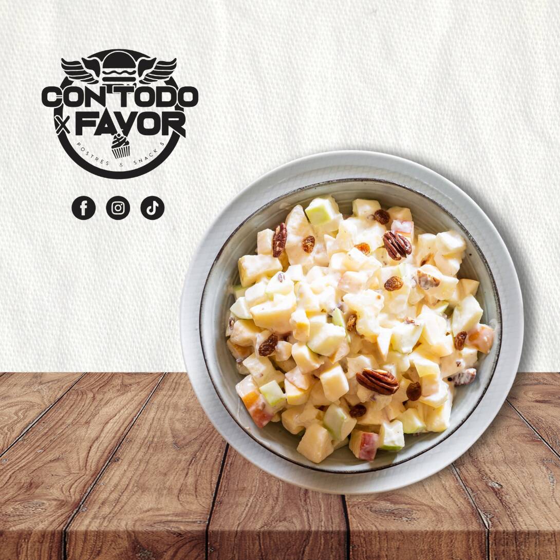 Manzana en cubos bañada con nuestra crema preparada, lechera, pasas y nuez.