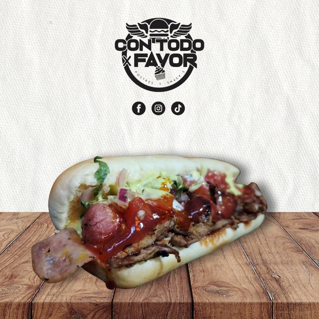 Pan, salchicha, mayonesa, catsup, cebolla, jitomate, rajas, tocino y piña asada con bbq.