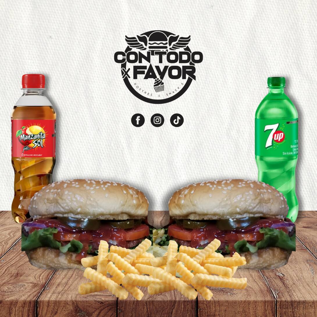 2 Burger clásicas (cada una con su porción de papas) + 2 Refrescos de 355ml