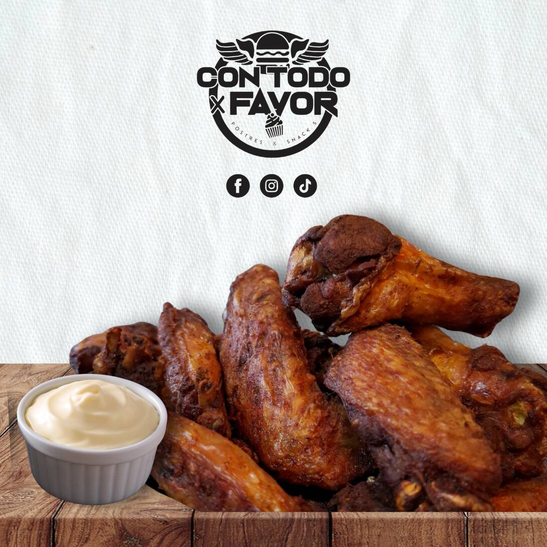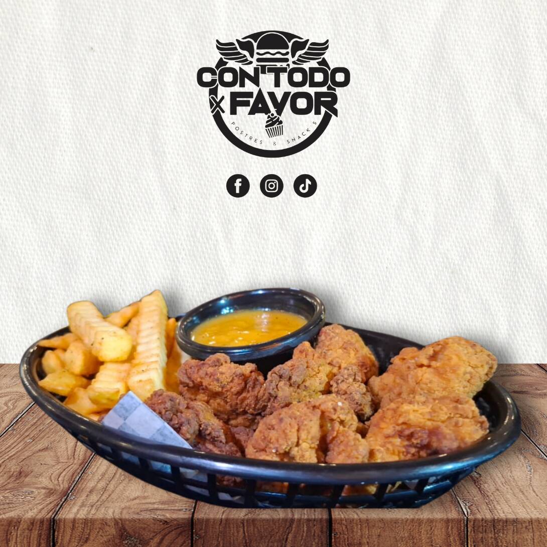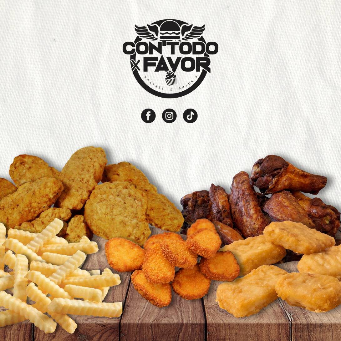 5 alitas + 5 nuggets + 100gr. de palomitas de pollo + 100gr. de boneless + porción de papas