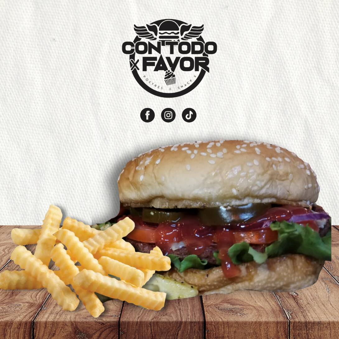 Pan, carne, queso manchego, jitomate, cebolla, lechuga, cátsup, mayonesa y rajas. Incluye pequeña porción de papas