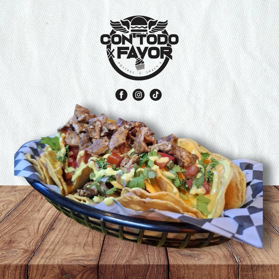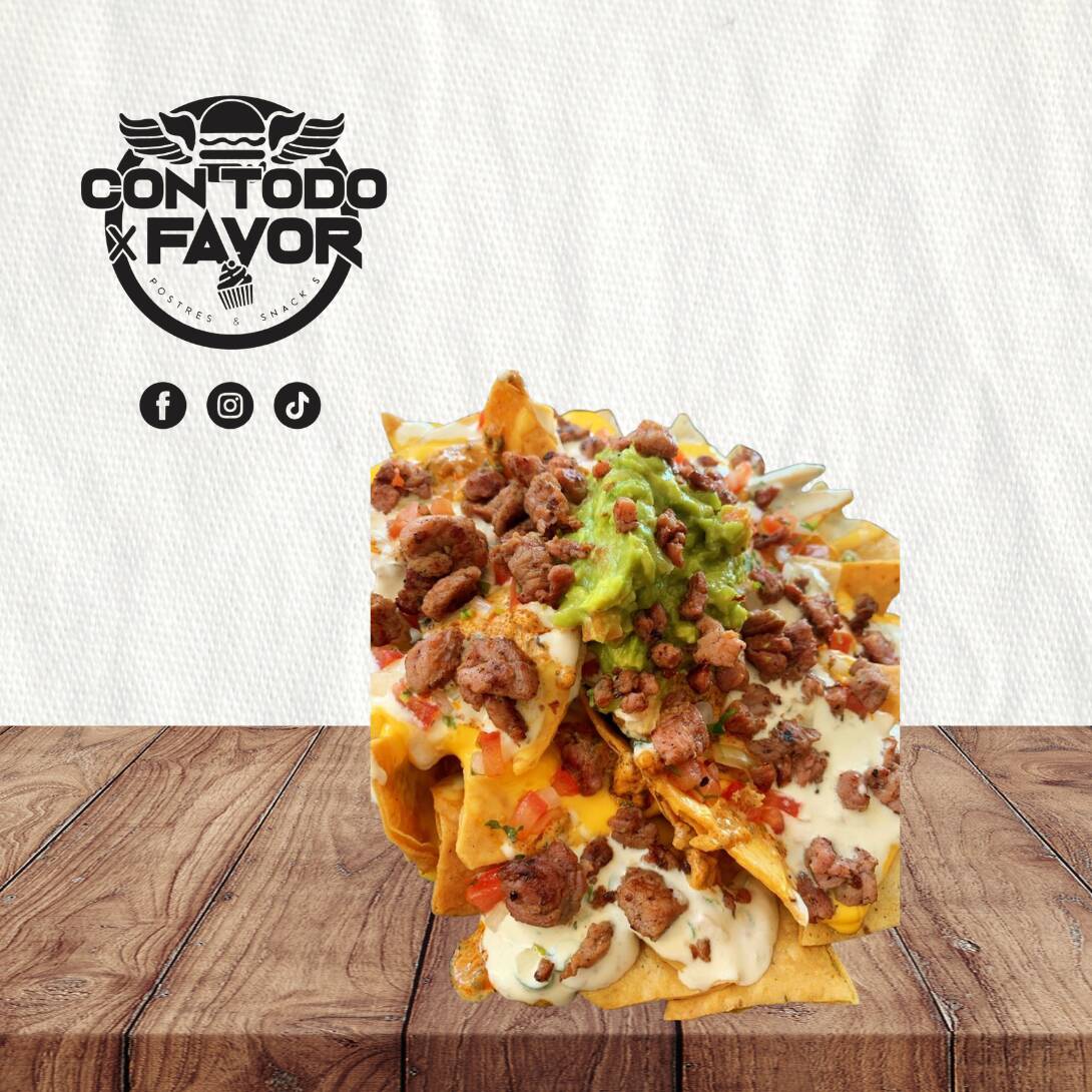 Totopo nacho con frijoles, queso amarillo, pico de gallo, carne asada, guacamole-habanero y rajas