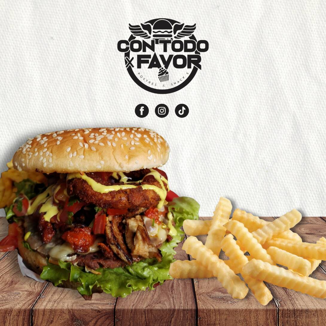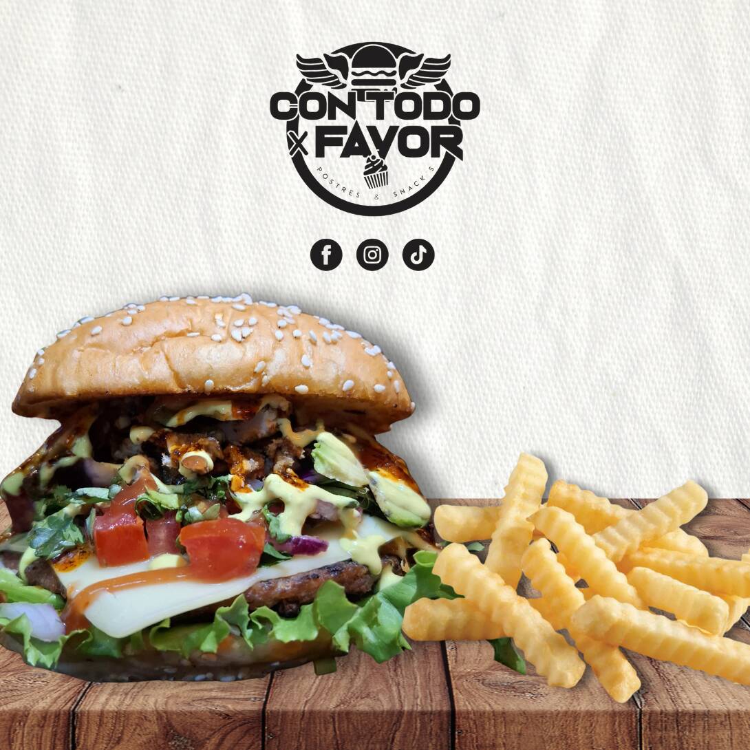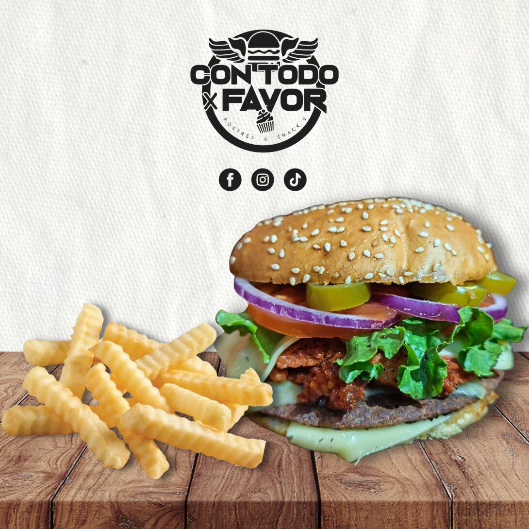 Pan, carne, doble queso manchego, pico de gallo, carne asada, chorizo, aros de cebolla, aderezo guacamole-habanero, aguacate, cátsup, mayonesa y salsa macha. Incluye pequeña porción de papas