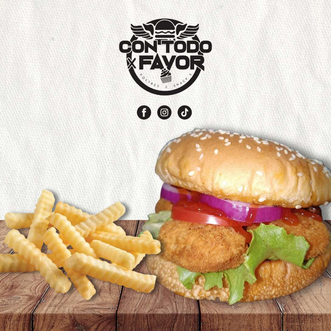 Pan, carne, queso manchego, jitomate, cebolla, lechuga, nuggets, cátsup, mayonesa y rajas. Incluye pequeña porción de papas
